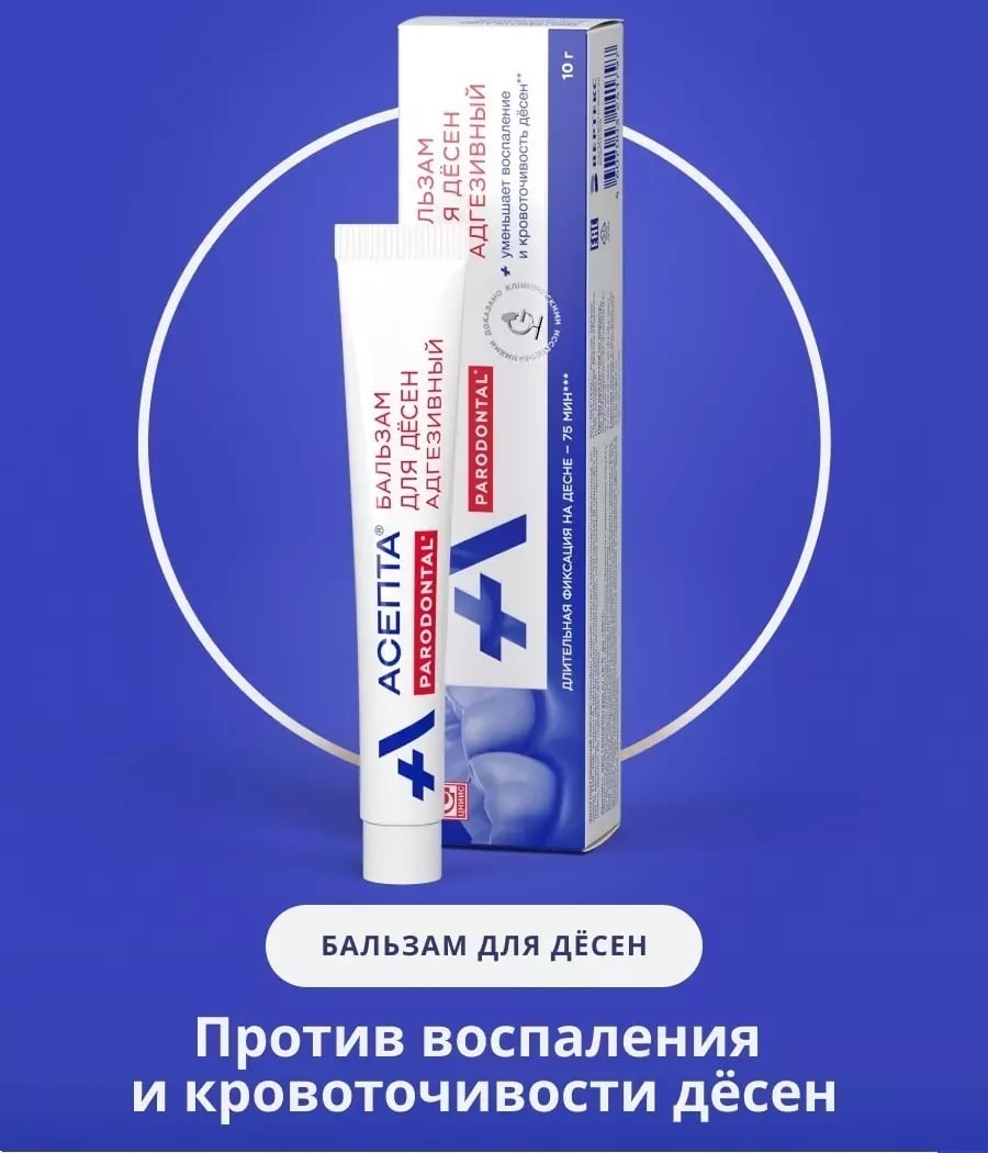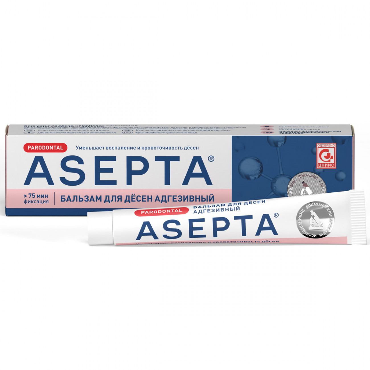 Асепта (Asepta) адгезивный бальзам для десен широкого спектра действия на основе хлоргексидина и метронидазола эффективно борется с возбудителями заболеваний дёсен. Наличие в составе адгезивных компонентов приводит к длительной фиксации бальзама на десне – около 75 минут. Уникальная комбинация и продолжительное воздействие активных веществ способствуют сокращению периода заживления.