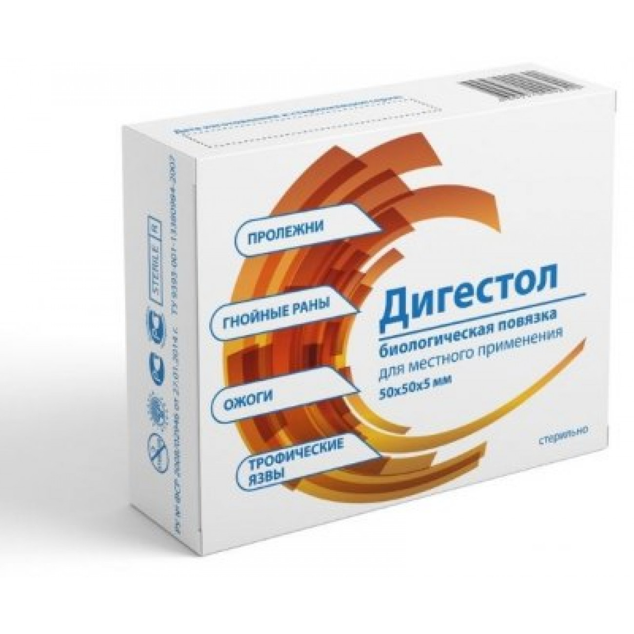 1. Повязка биологическая "Дигестол" 50х50 мм по 1 штуке в стерильной упаковке, помещенной в картонную пачку
