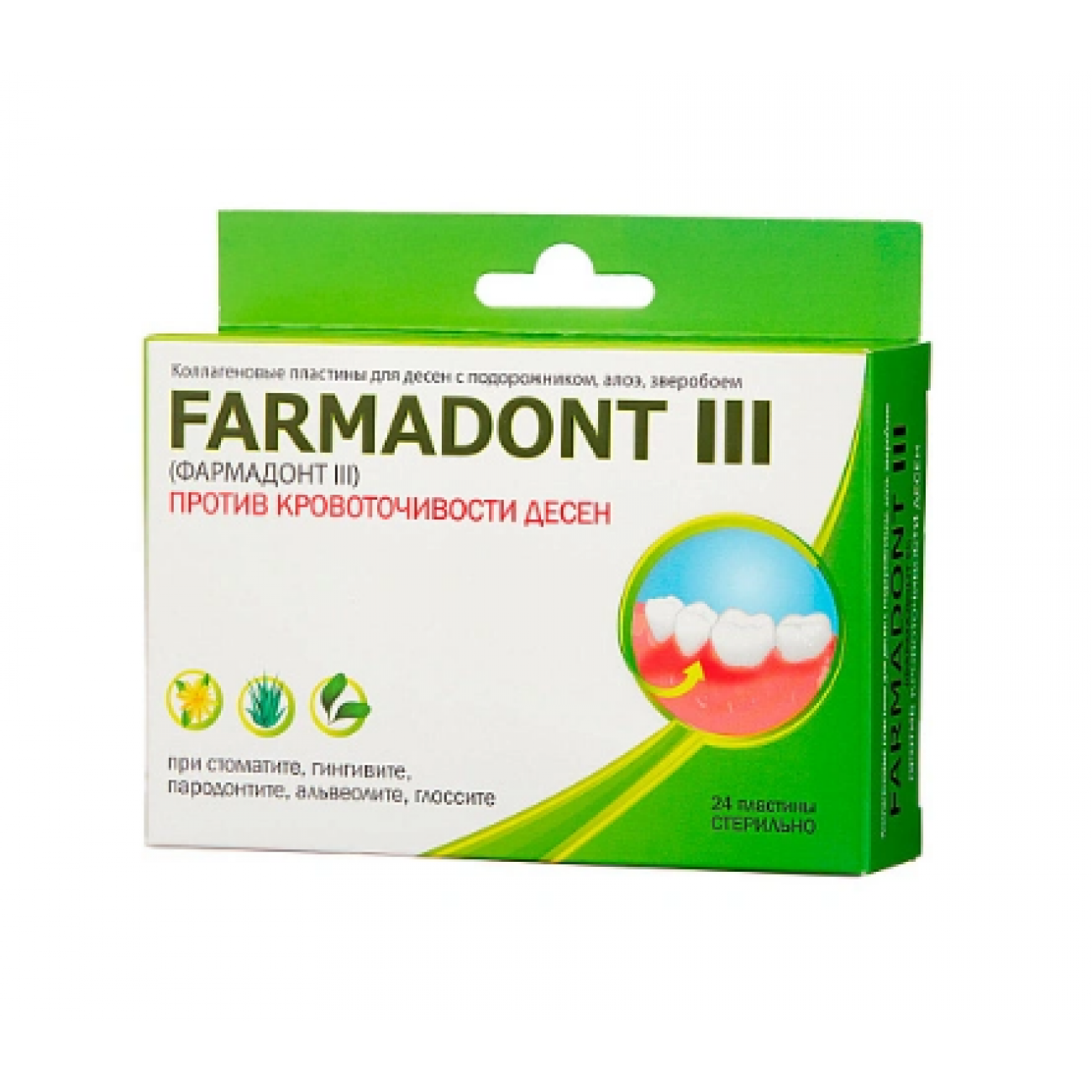 Коллагеновые пластины для дёсен Farmadont III с подорожником, зверобоем и алоэ используют против кровоточивости десен. В составе пластин — экстракты лекарственных растений, а также косметического и природного коллагена.