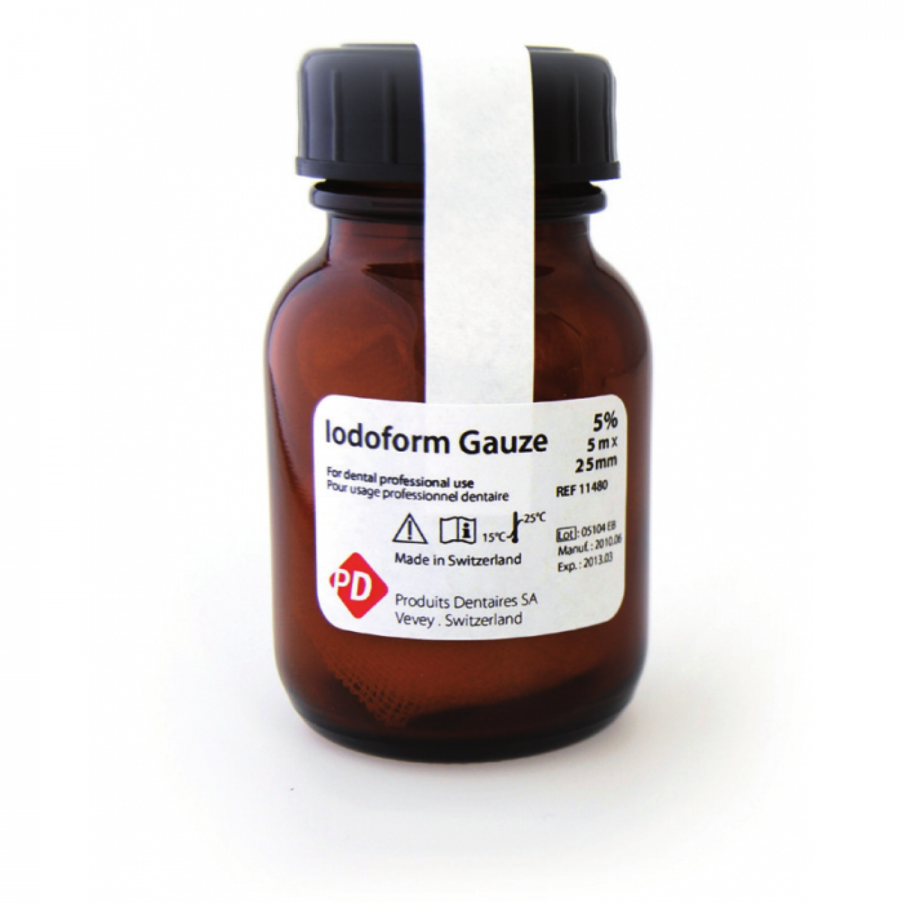 В качестве основы иодоформного бинта используется тампонадный бинт из 100% хлопка в 24 нити с ткаными кромками.100 г бинта содержит 5 г иодоформа.
