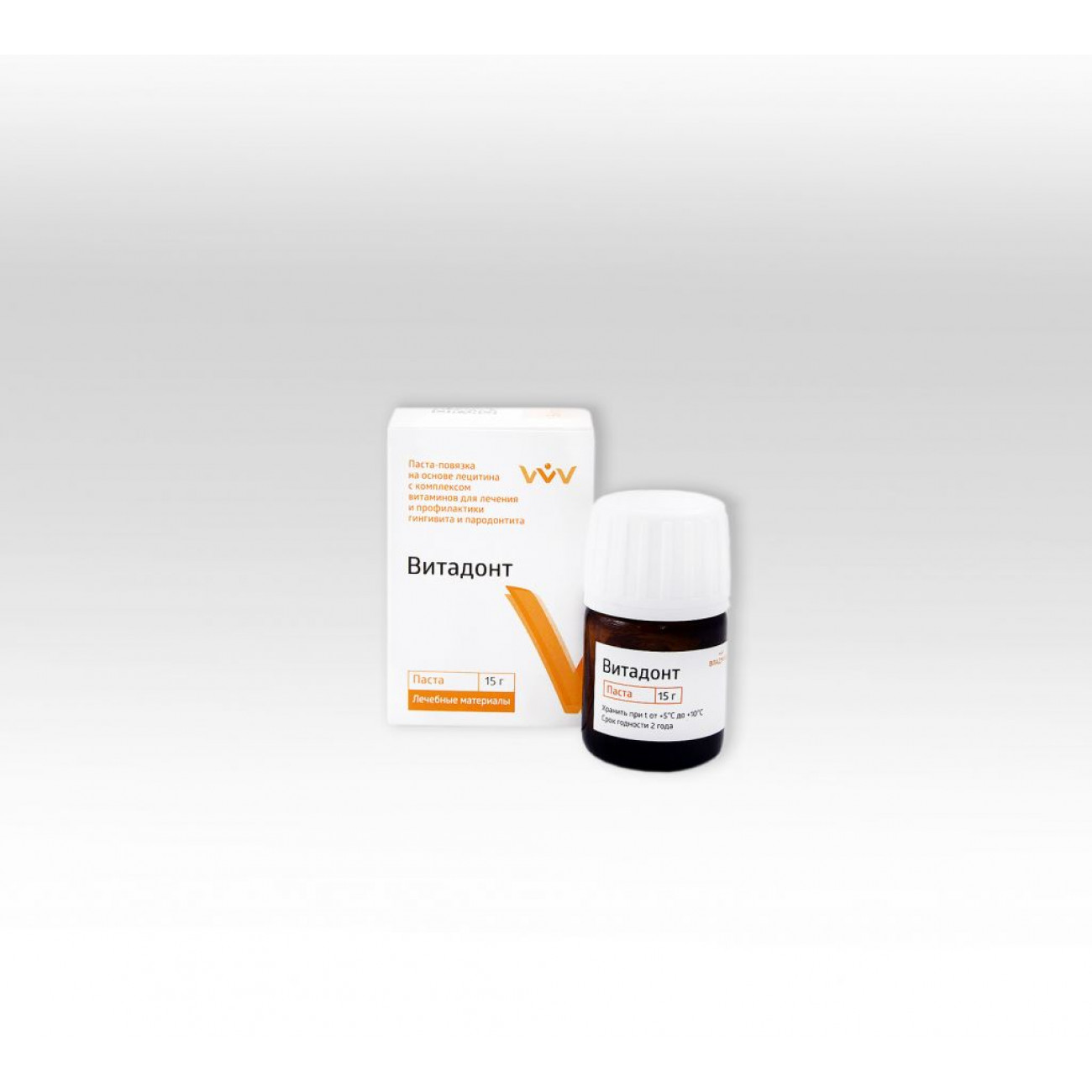 «Витадонт» - антибактериальная паста-повязка, представляет собой витаминизированный комплекс на основе воско-лецитиновой композиции, содержащий бета-каротин, витамин Е и С. Паста оказывает успокаивающее и обезболивающее действие.