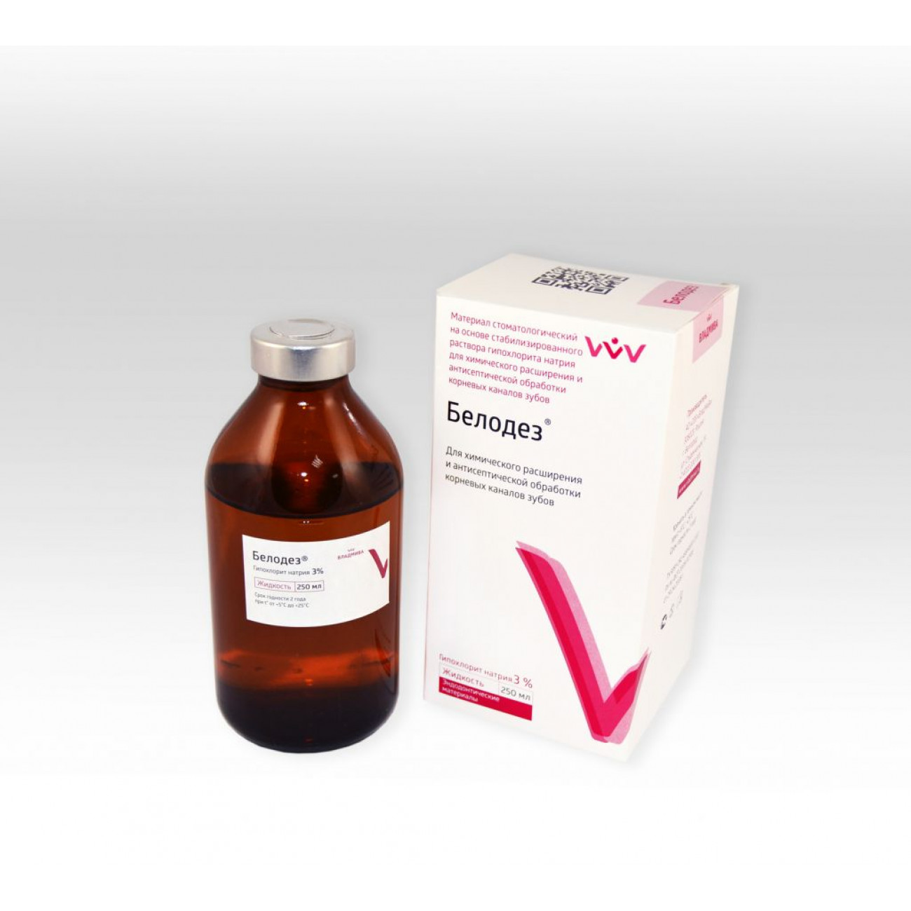 Стабилизированный раствор гипохлорита натрия Белодез 3% от компании ВладМиВа используется в качестве единого средства для постоперационной медикаментозной обработки корневых каналов и полости зуба. Благодаря образованию хлорамина и щелочным свойствам препарата (рН 10,0-12,0) Белодез 3% обладает выраженным кровоостанавливающим, отбеливающим и бактерицидным действием в отношении всех грамположительных и грамотрицательных микроорганизмов, грибов и вирусов без цитотоксичности на уровне верхушки корня.