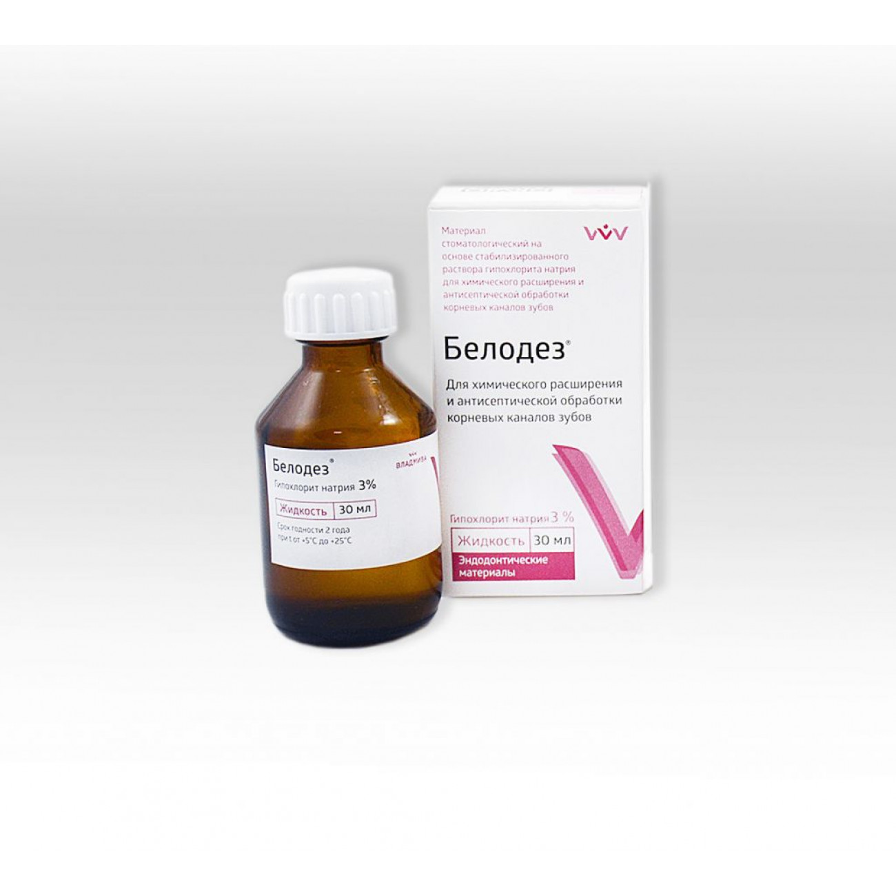 «Белодез» представляет собой стабилизированный раствор (гель) гипохлорита натрия, растворяет органическую основу дентина: как живые (химически фиксированные) так и некротизированные ткани. Гелеобразная форма выпуска позволяет успешно применять материал для антисептической обработки полостей зубов верхней челюсти, поскольку он обладает достаточной вязкостью, текучестью и щадяще воздействует на слизистую.