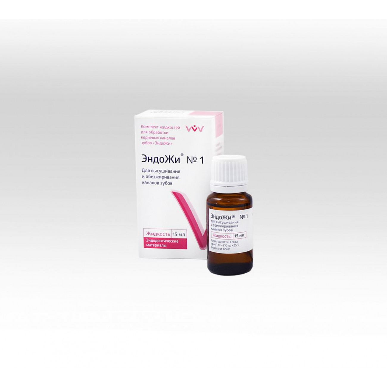 «ЭНДОЖИ №1» - для высушивания и обезжиривания каналов, не содержит диэтилового эфира и этанола, легко испаряется. Высушивание и обезжиривание каналов происходит в течение 1 минуты без применения осушающей струи сжатого воздуха.