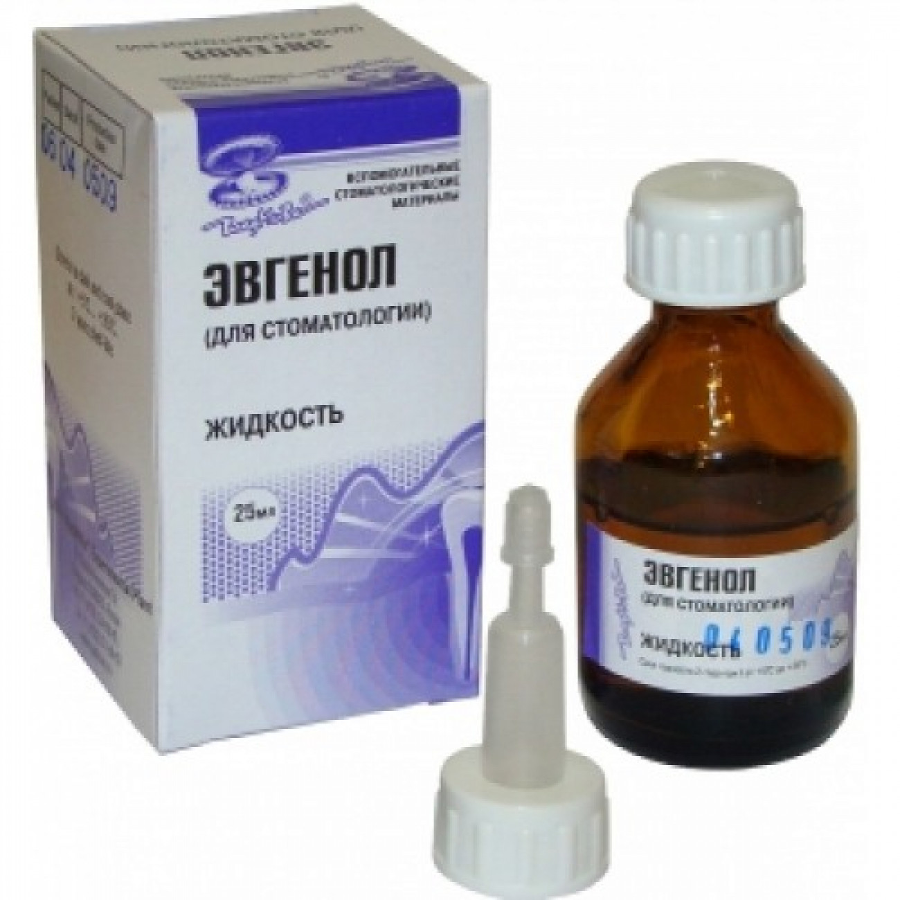 вгенол - применяется для антисептической обработки корневых каналов в процессе подготовки их к пломбированию. В качестве жидкости для затвердевающей пасты на основе окиси цинка для пломбирования корневых каналов. Как успокаивающее средство (местный анальгетик) при болевых ощущениях, возникающих в пульпе. Эвгенол получают из гвоздичного масла или эвгенольного базилика. Срок годности 5 лет. Упаковка: флакон с жидкостью 25 мл.
