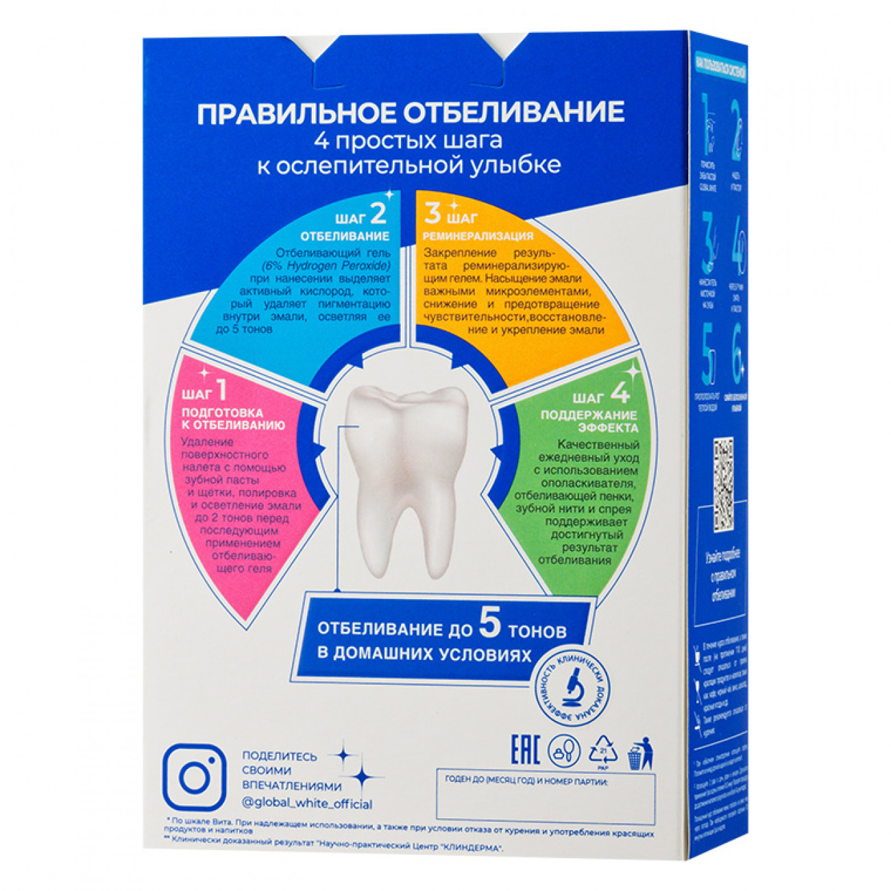 Для наилучшего результата рекомендуется соблюдать всю этапность, предложенную брендом GLOBAL WHITE: подготовка, отбеливание, реминерализация, ежедневный уход