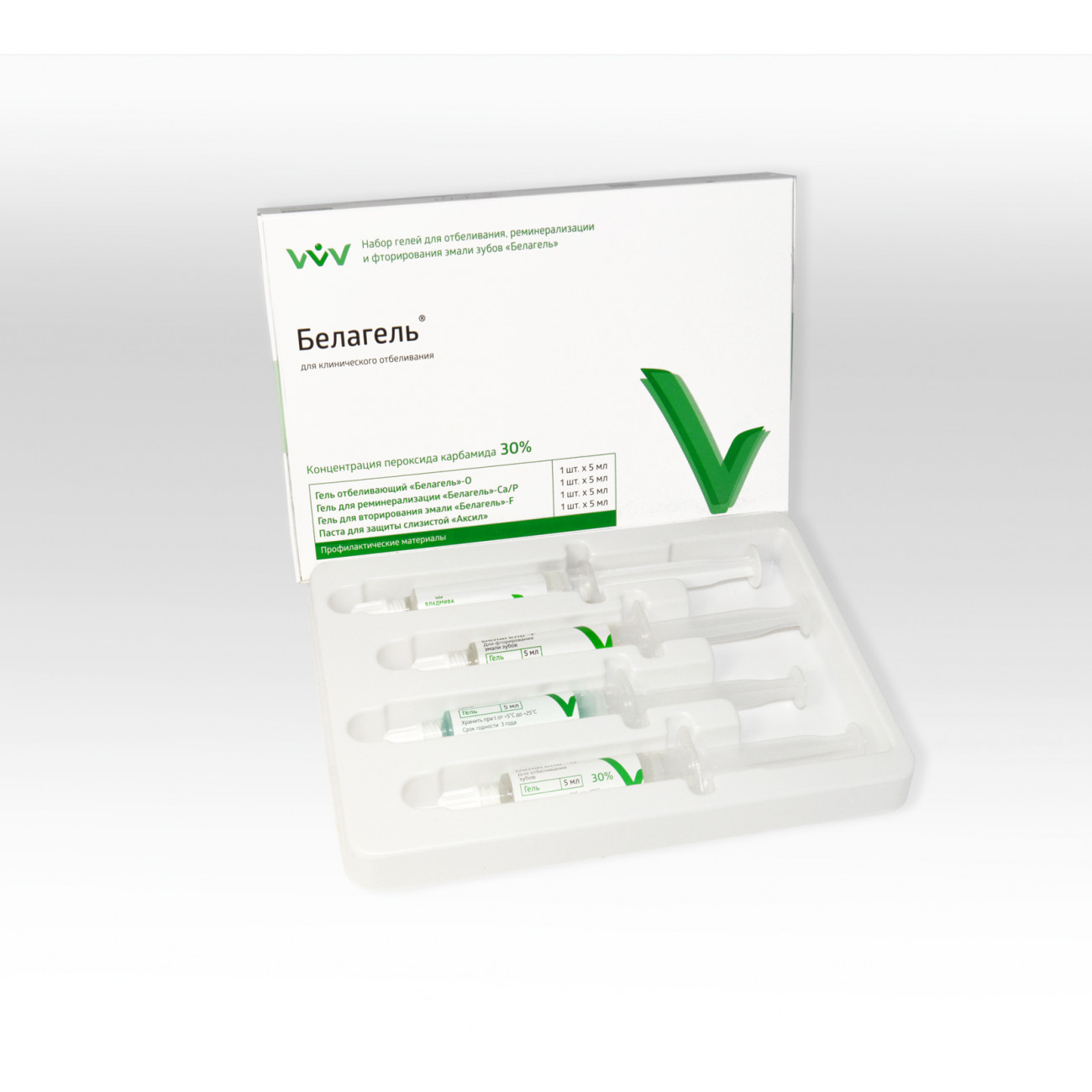 «Белагель О», входящий в состав набора, предназначен для устранения дисколораций, как изначально имевшихся на зубах, так и появившихся с возрастом, а также для отбеливания депульпированных зубов.