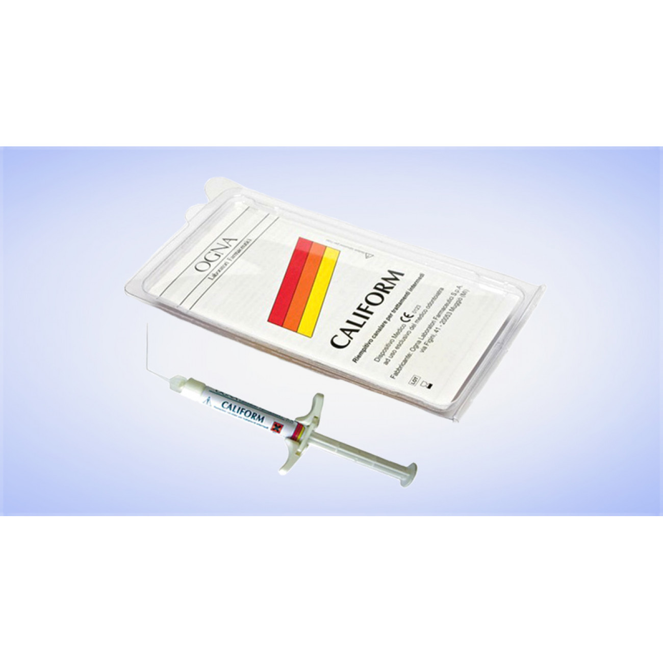 CALIFORM - новый лечебный материал, применяемый в эндодонтической практике, на основе гидроксида кальция с йодоформом и силиконовым маслом. Обеспечивает продолжительный бактерицидный эффект внутри инфицированных каналов, имеет высокое значение pH среды. Стимулирует восстановление костной ткани. Снимает и предотвращает воспалительные явления в периапикальных тканях. Оказывает заживляющее действие и предотвращает рост бактерий в корневом канале. Не окрашивает ткани зуба. Рентгеноконтрастен.