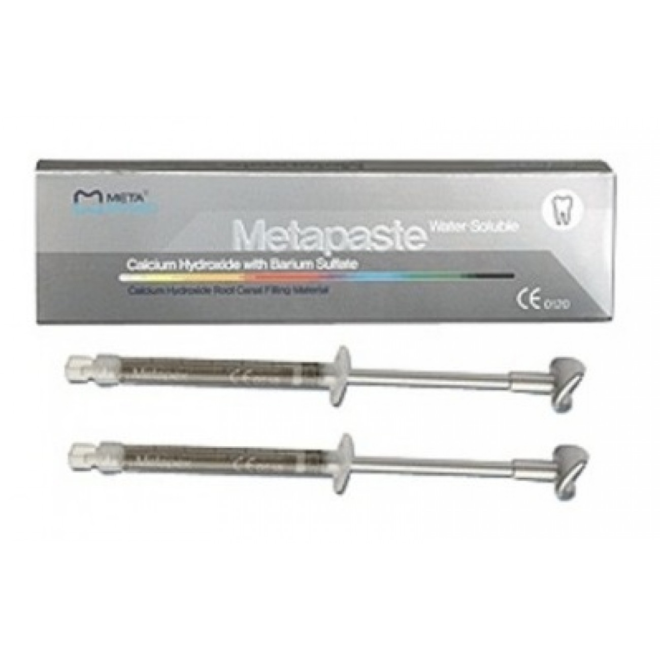 Metapaste незатвердевающая белая паста на основе гидроксида кальция в пластиковых шприцах для временного пломбирования корневых каналов, готовая к применению.