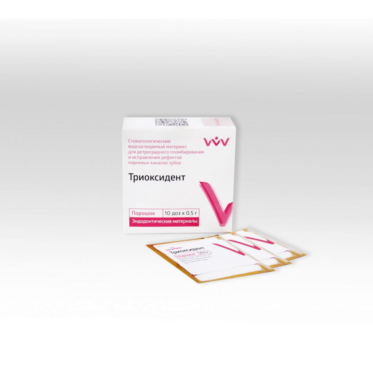 Основными компонентами водозатворимого стоматологического материала Триоксидент являются оксиды кальция, кремния, алюминия. При смешивании порошка с дистиллированной водой в весовом соотношении 3:1 образуется удобная в применении паста, не теряющая пластичность в течение 10-15 минут при комнатной температуре 18-23С и влажности 5010%. Для получения пластичной пасты в порошок введен пластификатор, предупреждающий быстрое подсыхание материала на пластине для замешивания.