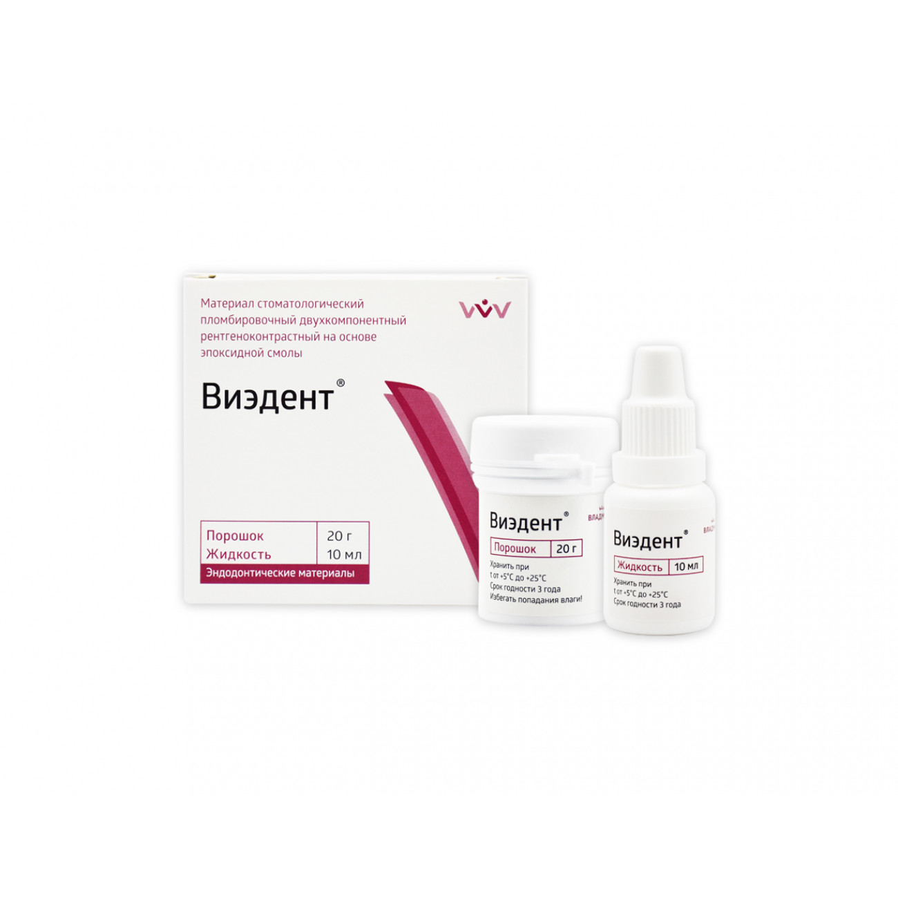 Материал «Виэдент» двухкомпонентный порошок-жидкость или паста-паста, рентгеноконтрастный материал на основе гидроокиси кальция эпоксидной смолы.