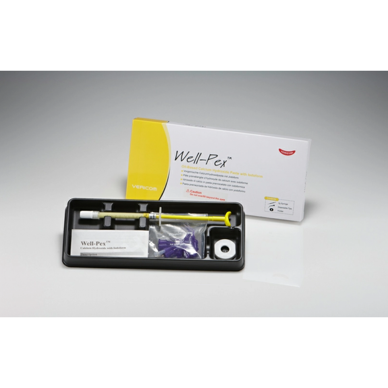 Well-Pex - материал для пломбирования каналов (Гидроксид кальция с йодоформом, 1 шприц 2 г) Well-Pex™ – пломбировочный материал для пульпы и зараженных корневых каналов зуба, который так же является хорошим внутриканальным медикаментом. Well-Pex™ содержит в своем составе гидроксид кальция и йодоформ, имеет хорошую рентгеноконтрастность и антибактериальные свойства. Well-Pex™ – обладает стабильной конистенцией без разделения или отслоения, высокой текучестью и находится в удобном шприце. Также Well-Pex™ легко достигает апекса и обладает биосовместимость с перипикальными тканями.