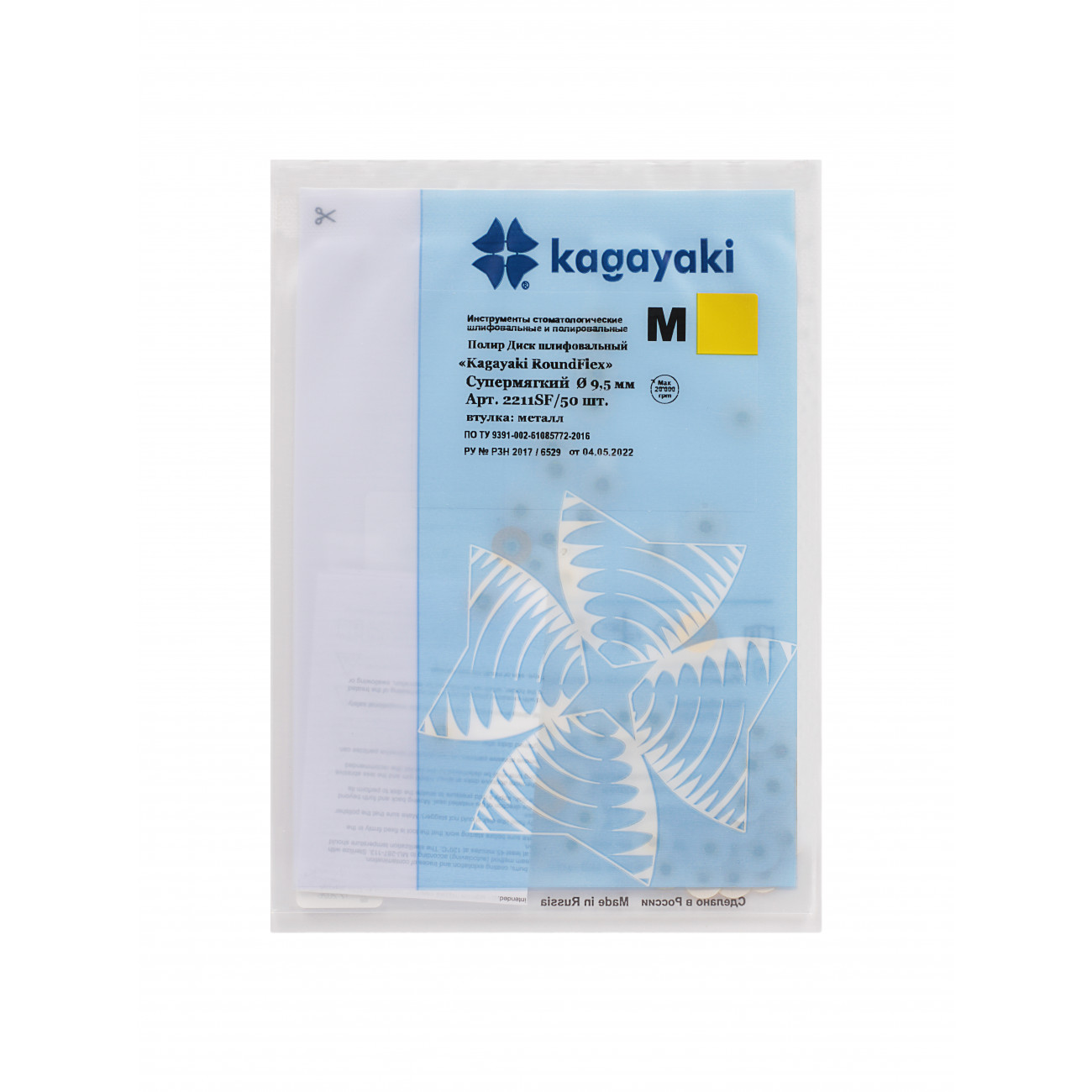 Kagayaki RoundFlex M 2211SF/50 — профессиональная система шлифовальных и полировальных дисков повышенной жёсткости, оснащённых металлической втулкой. Диски очень мелкой абразивности разработаны специально для получения абсолютно гладкой глянцевой поверхности реставрации. Сочетание высокопрочного полиэстера с частицами оксида алюминия обеспечивает исключительную износостойкость и длительный срок службы. Для надёжной фиксации используется уникальная система крепления Kagayaki: специальный дискодержатель не только обеспечивает прочное соединение с металлической втулкой, но и создаёт оптимальное положение рабочей поверхности за счёт возвышения головки над втулкой диска. Цанговый механизм гарантирует стабильную фиксацию диска на оси устройства, обеспечивая безопасность и эффективность.