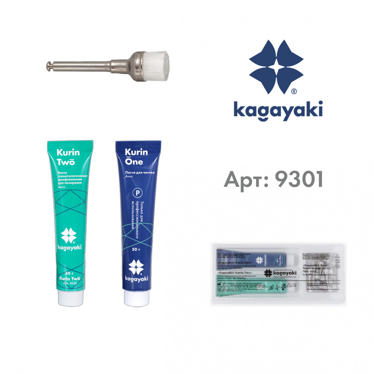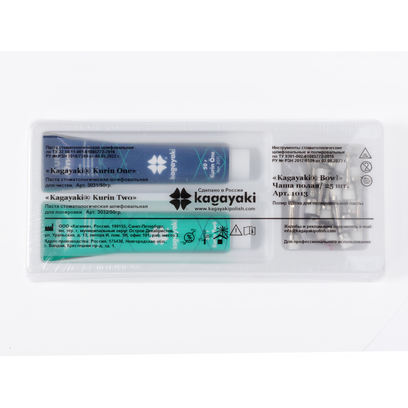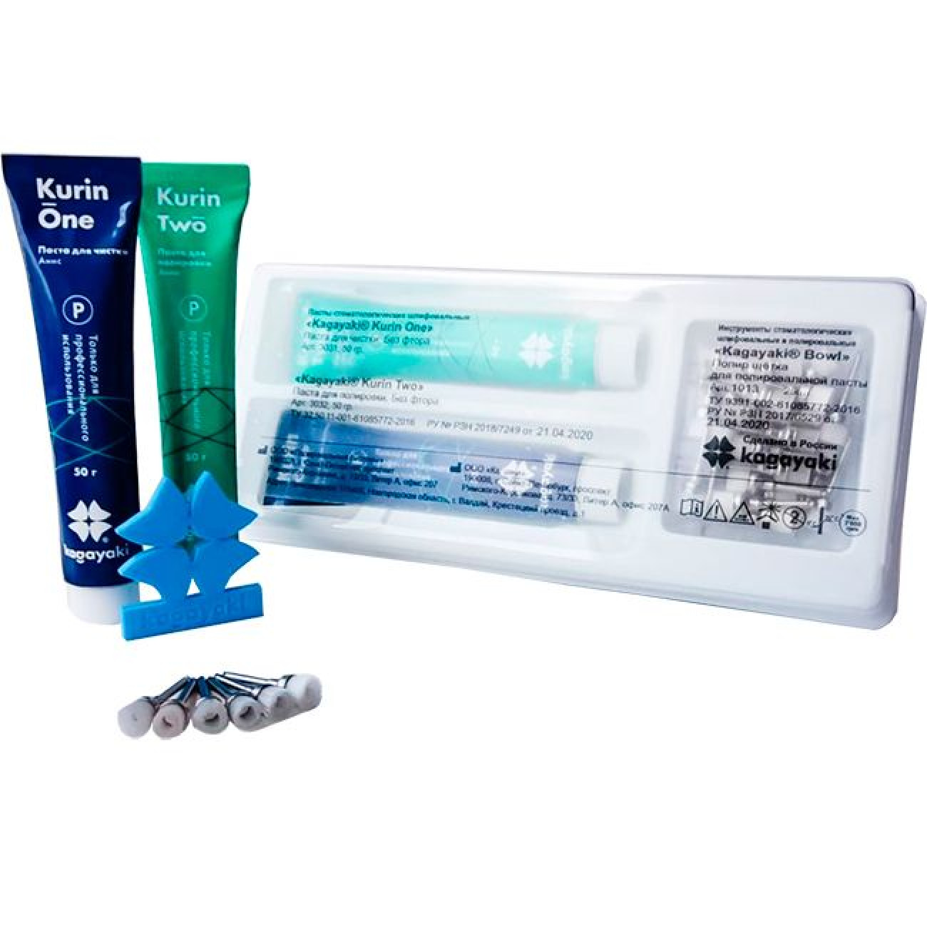 У нас вы можете купить комплект для двухэтапной чистки и полировки поверхности твёрдых тканей зубов (паста для чистки Kurin One + паста для полировки Kurin Two + 25 нейлоновых щёток Bowl) от Kagayaki по доступной цене.