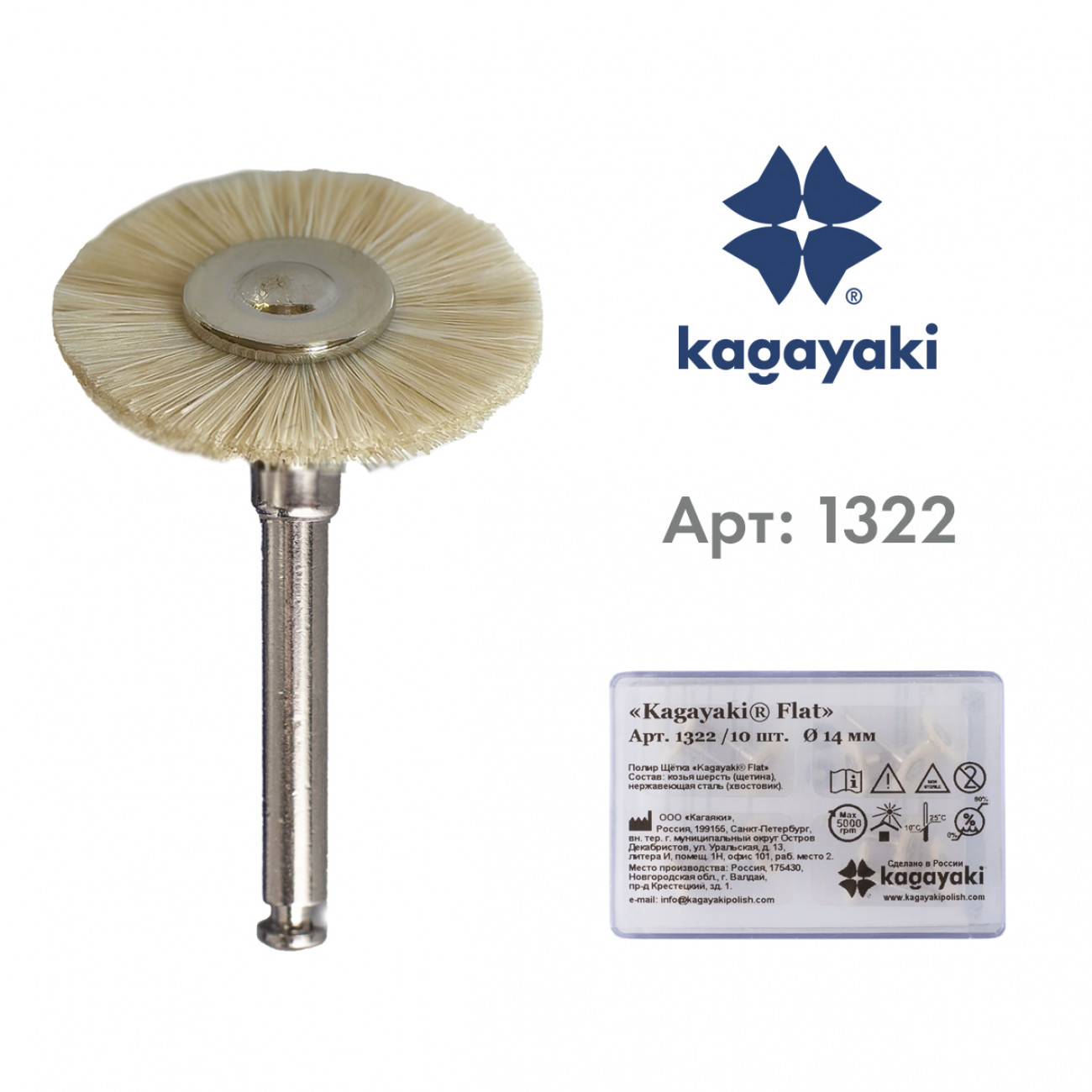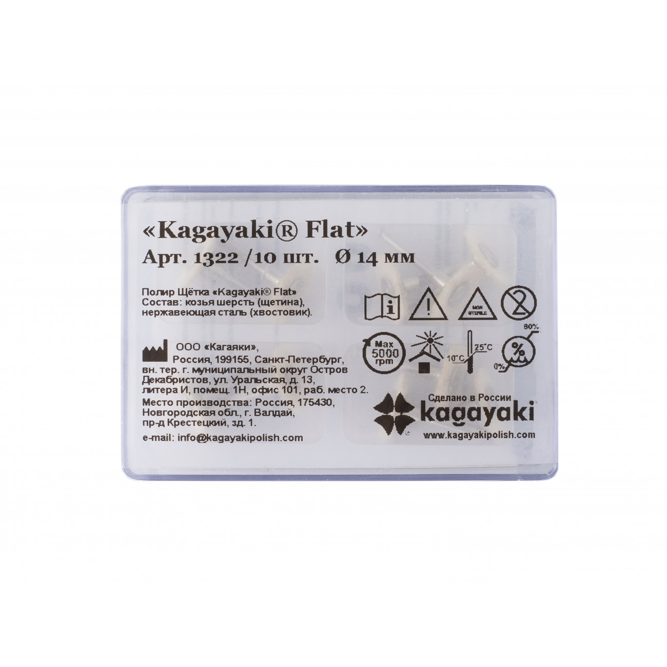 Щётки Kagayaki Flat — щётки в форме диска из высококачественной козьей шерсти, разработанные для завершающей полировки керамических и композитных реставраций, обеспечивая им зеркальный блеск. Щётка эффективно удаляет мягкие и твёрдые зубные отложения, подходя для финишной обработки поверхностей из композитов, компомеров, стеклоиономеров и керамики.