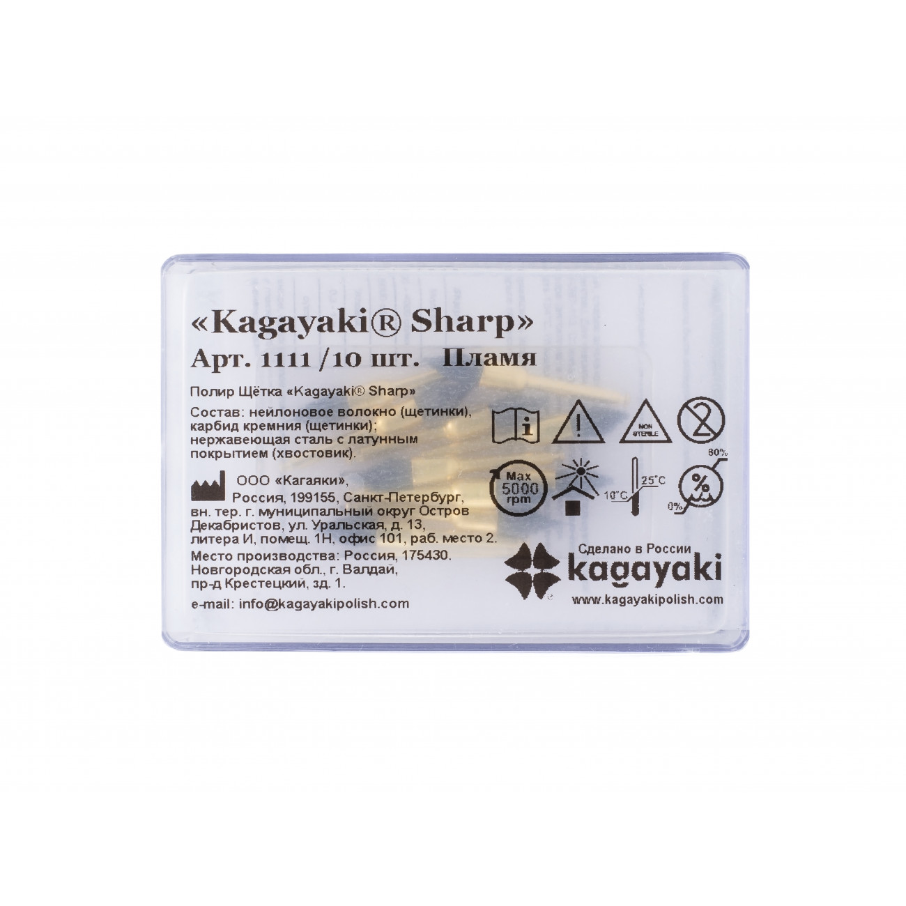 Щётки Kagayaki Sharp — инструмент для финишной обработки зубных реставраций из композитов, компомеров и стеклоиономеров. Конструкция с конусообразной чашей, напоминающей форму пламени, обеспечивает доступ к сложным участкам. Нейлоновые волокна насыщены абразивными частицами карбида кремния, исключающими необходимость использования полировочных паст. Грубая текстура щётки позволяет эффективно устранять шероховатости, создавая гладкую поверхность.