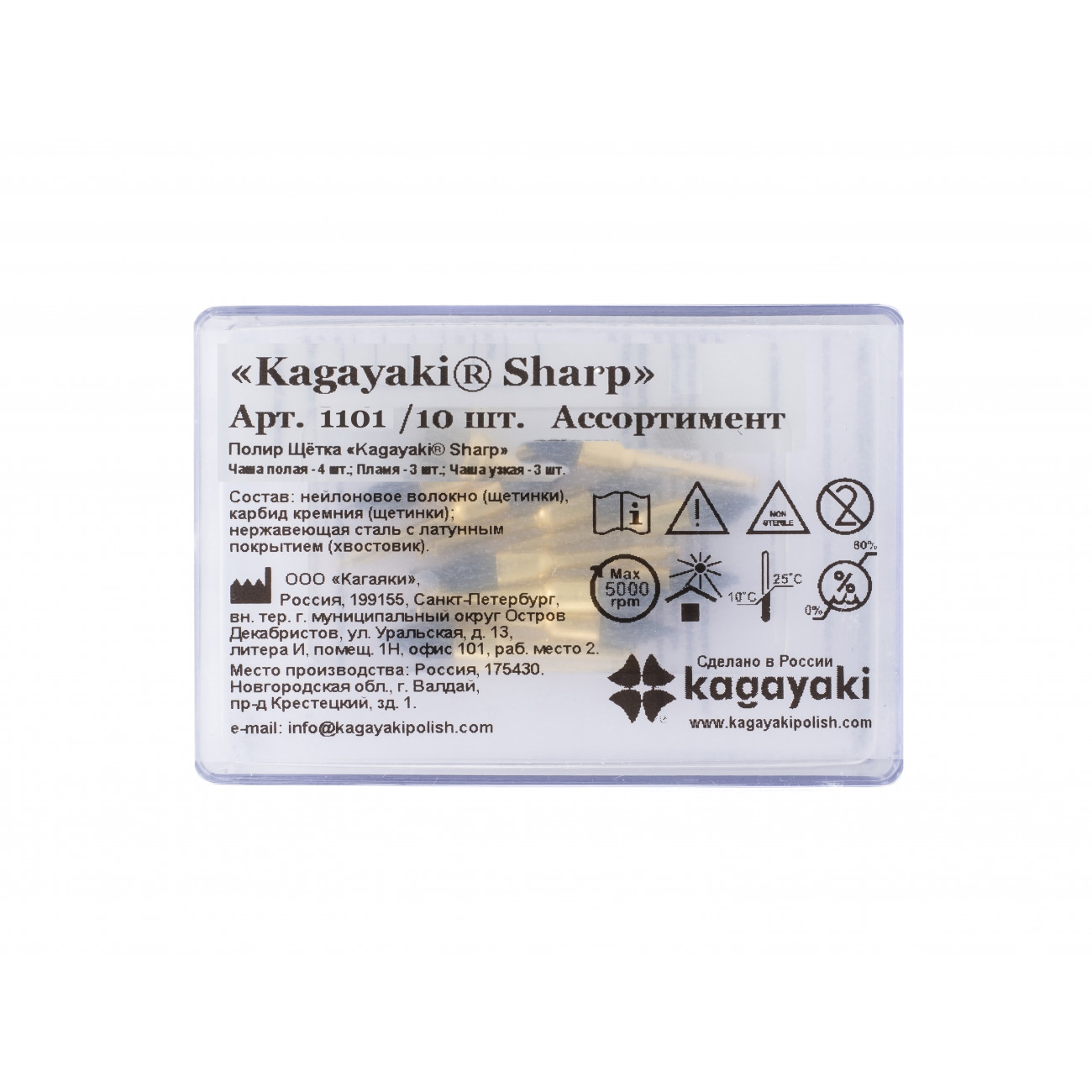 Щётки Kagayaki Sharp — инструмент для финишной обработки зубных реставраций из композитов, компомеров и стеклоиономеров. Три различные формы щёток (чаша полая широкая, чаша узкая, пламя) обеспечивают эффективную полировку даже в труднодоступных зонах и доступ к сложным участкам. Нейлоновые волокна насыщены абразивными частицами карбида кремния, исключающими необходимость использования полировочных паст. Грубая текстура щётки позволяет эффективно устранять шероховатости, создавая гладкую поверхность.