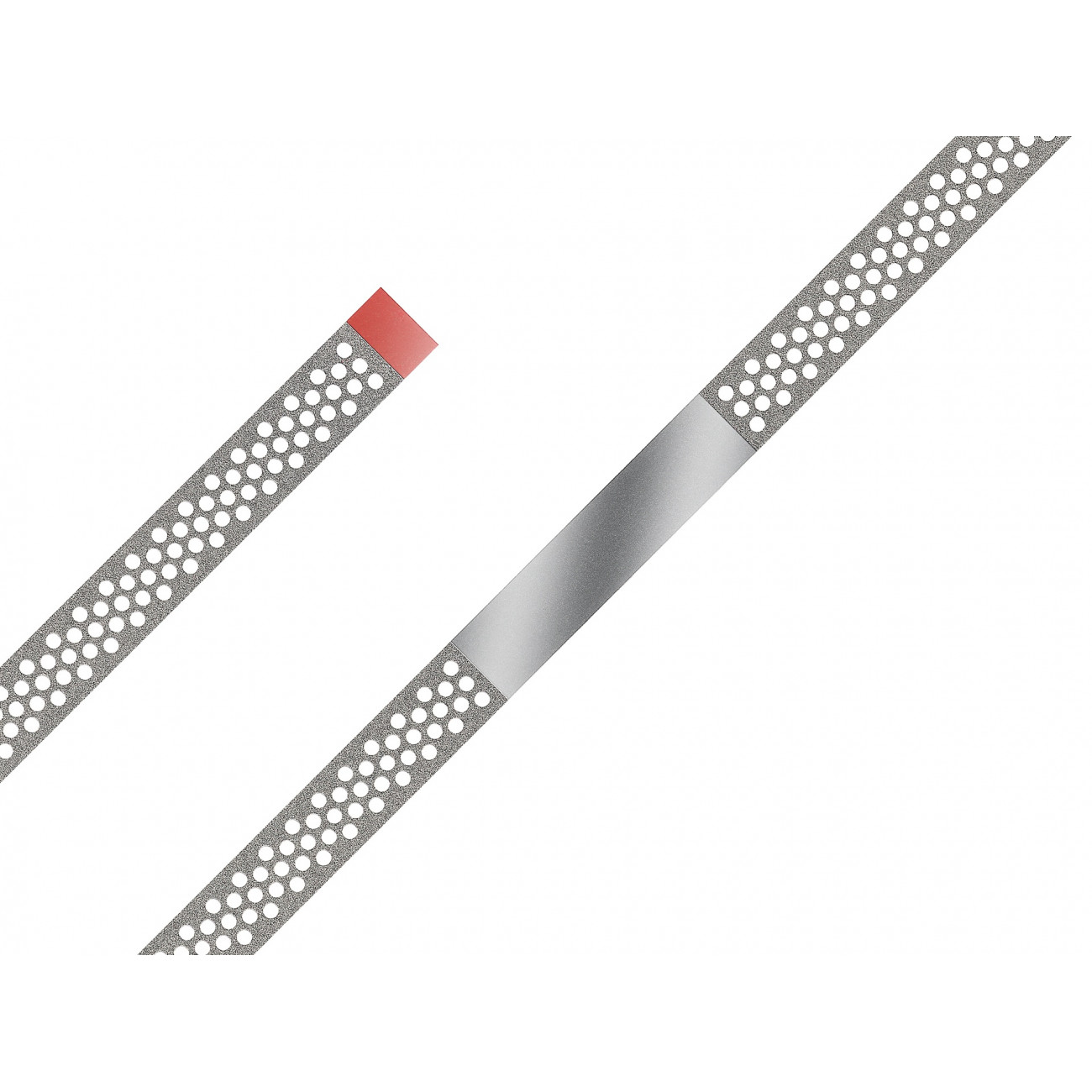 Полоски алмазные перфорированные стоматологические NTI FS3-FP мелкой зернистости с красной маркировкой предназначены для ручной шлифовки апроксимальных поверхностей керамических пломб, коронок и виниров в межзубном пространстве, а также для препарирования зубов в ортодонтии.