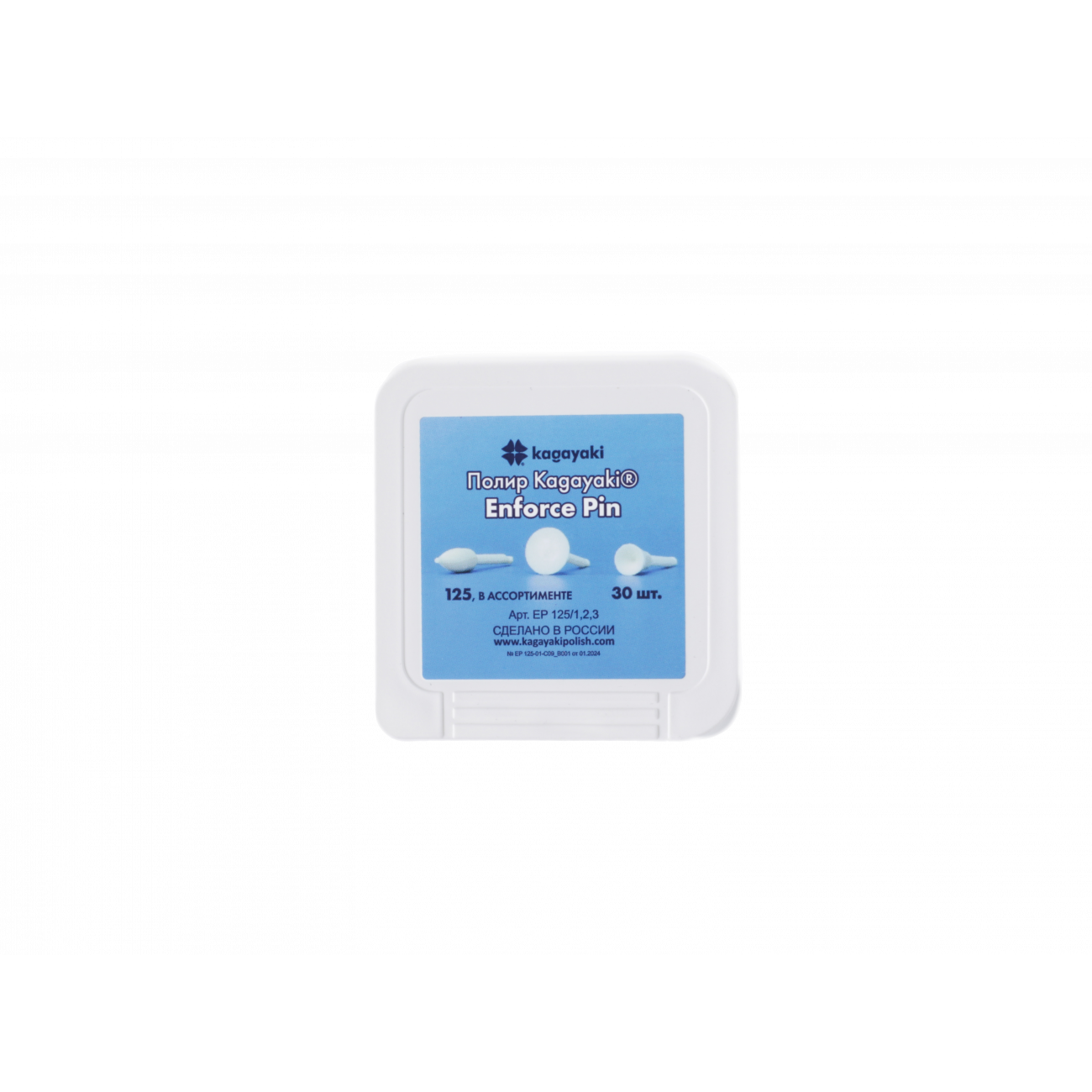 Набор полиров Kagayaki Enforce pin — одноразовые уретановые полиры на полимерном пине трёх различных форм (диск, пуля, чашка), предназначенные для удаления излишков материала, контурирования и придания формы поверхностям композитных, компомерных и стеклоиономерных реставраций. Наполненные оксидом алюминия в качестве абразивного вещества на уретановом связующем, они отлично формируют поверхность.
