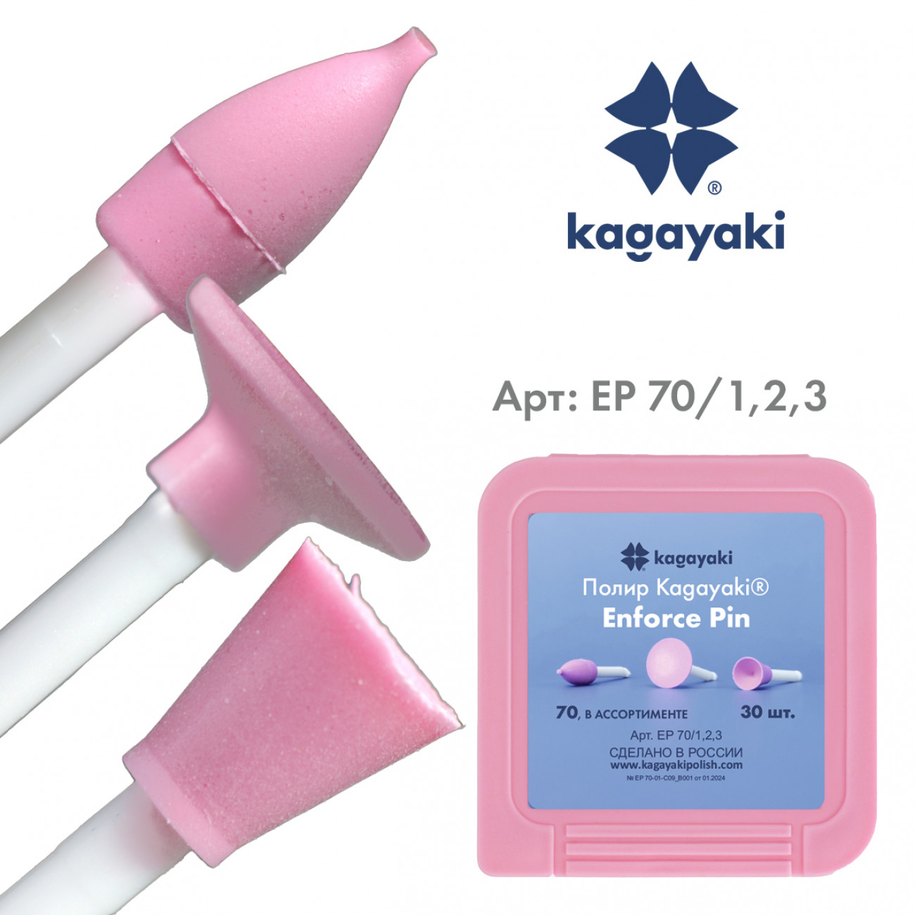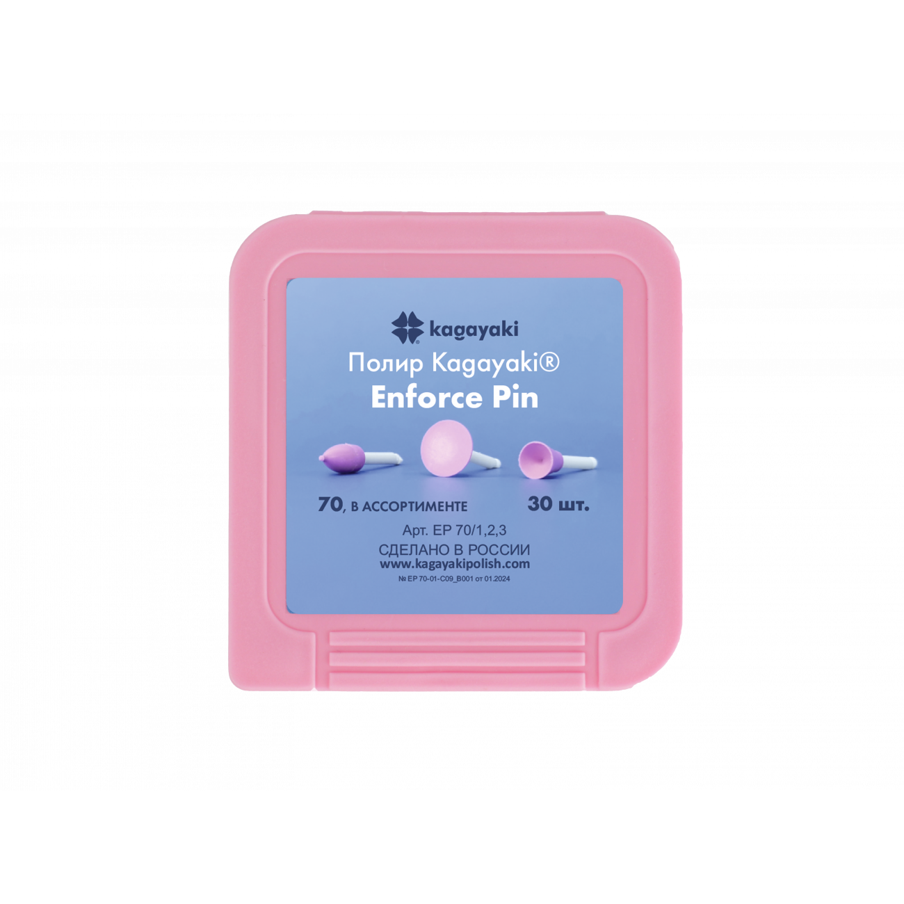 Набор полиров Kagayaki Enforce pin — одноразовые уретановые полиры на полимерном пине трёх различных форм (диск, пуля, чашка), предназначенные для подготовки реставрации к окончательной полировке, выравнивания шероховатостей и придания гладкости поверхностям композитных, компомерных и стеклоиономерных реставраций. Наполненные оксидом алюминия в качестве абразивного вещества на уретановом связующем, они отлично формируют поверхность.