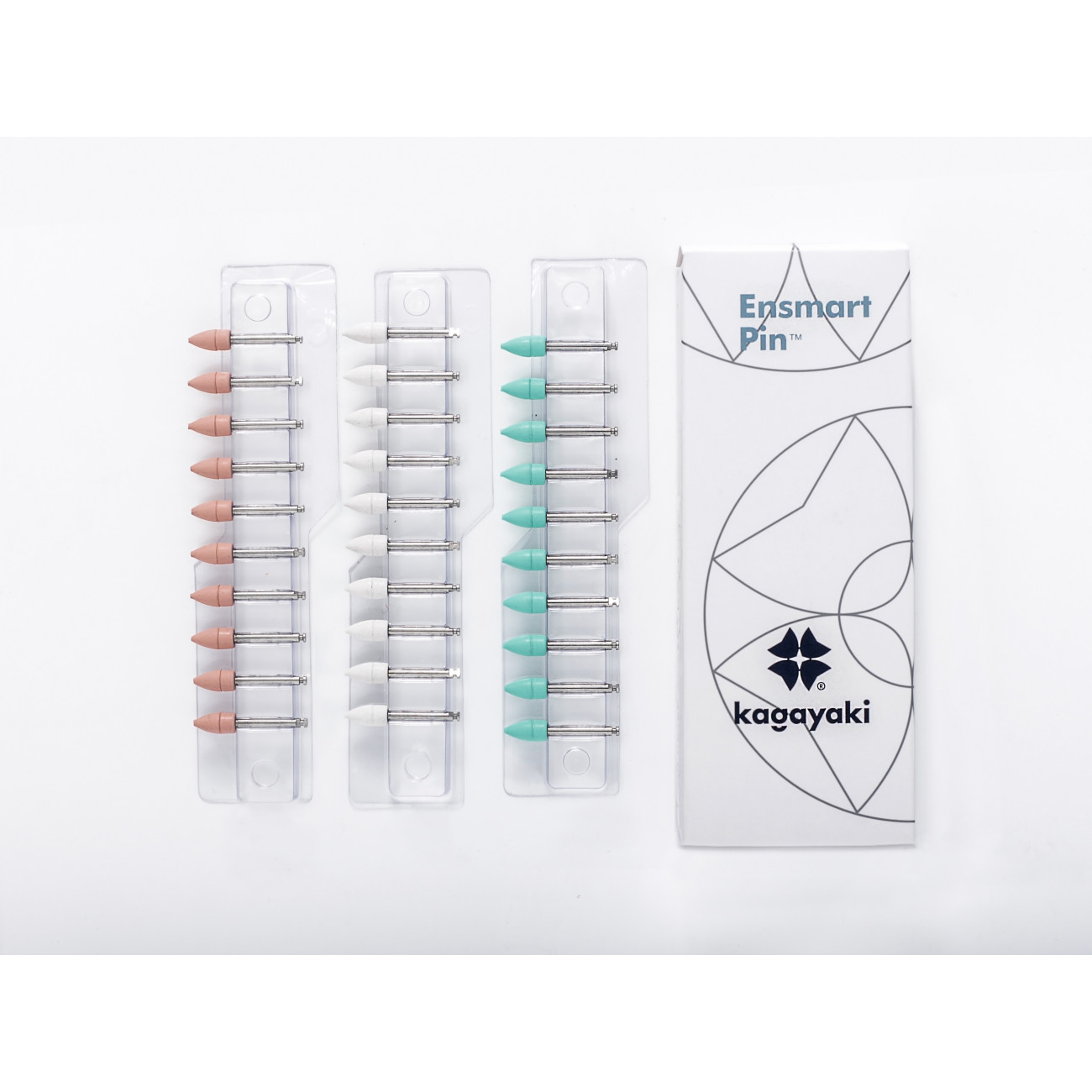 Набор полиров Kagayaki Ensmart pin — одноразовые силиконовые полиры на стальном пине в форме пули различной абразивности, предназначенные для контурирования, шлифовки и финишной обработки поверхностей композитных, компомерных и стеклоиономерных реставраций. Наполненные оксидом алюминия в качестве абразивного вещества на силиконовом связующем, они отлично шлифуют и полируют поверхность.