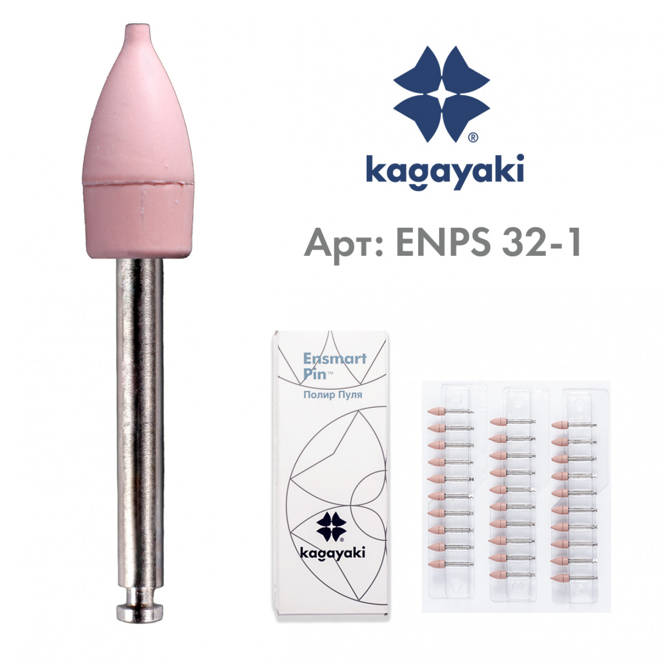 Набор полиров Kagayaki Ensmart pin — одноразовые силиконовые полиры на стальном пине в форме пули, предназначенные для придания сухого блеска (ультраблеска) поверхностям композитных, компомерных и стеклоиономерных реставраций. Наполненные оксидом алюминия в качестве абразивного вещества на силиконовом связующем, они отлично сглаживают поверхность.
