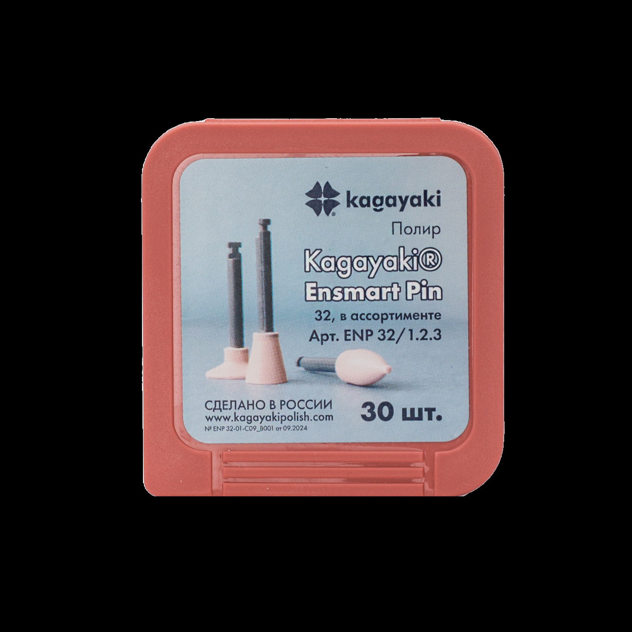 Набор полиров Kagayaki Ensmart pin — одноразовые силиконовые полиры на полимерном пине трёх различных форм (диск, пуля, чашка), предназначенные для придания сухого блеска (ультраблеска) поверхностям композитных, компомерных и стеклоиономерных реставраций. Наполненные оксидом алюминия в качестве абразивного вещества на силиконовом связующем, они отлично сглаживают поверхность.