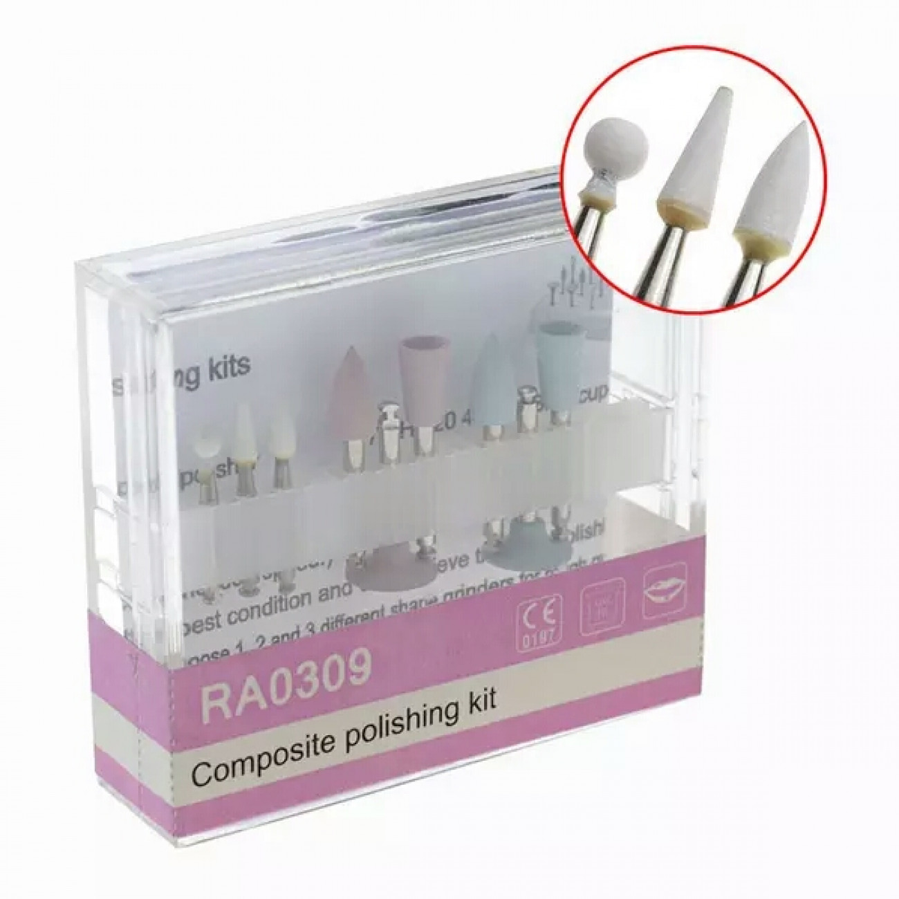 Представляем вашему вниманию полировочный набор для композитов и виниров №0309 RA. Этот набор включает в себя 3 керамические головки и 6 силиконовых головок, что обеспечивает широкий спектр возможностей для полировки различных поверхностей.
