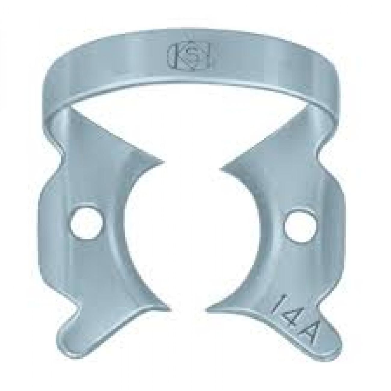 Кламп для коффердама KSK Dentech №14А - Кламп для частично прорезавшихся моляров верхней и нижней челюсти, а также для зубов, имеющих значительное разрушение коронковой части или полностью разрушенную мезиальную стенку. В отличие от клампа №14 имеет широкие щечки. Часто применяется для работы с кариозными поражениями твердых тканей зуба любой локализации и на зубах с коронковой частью большого размера.