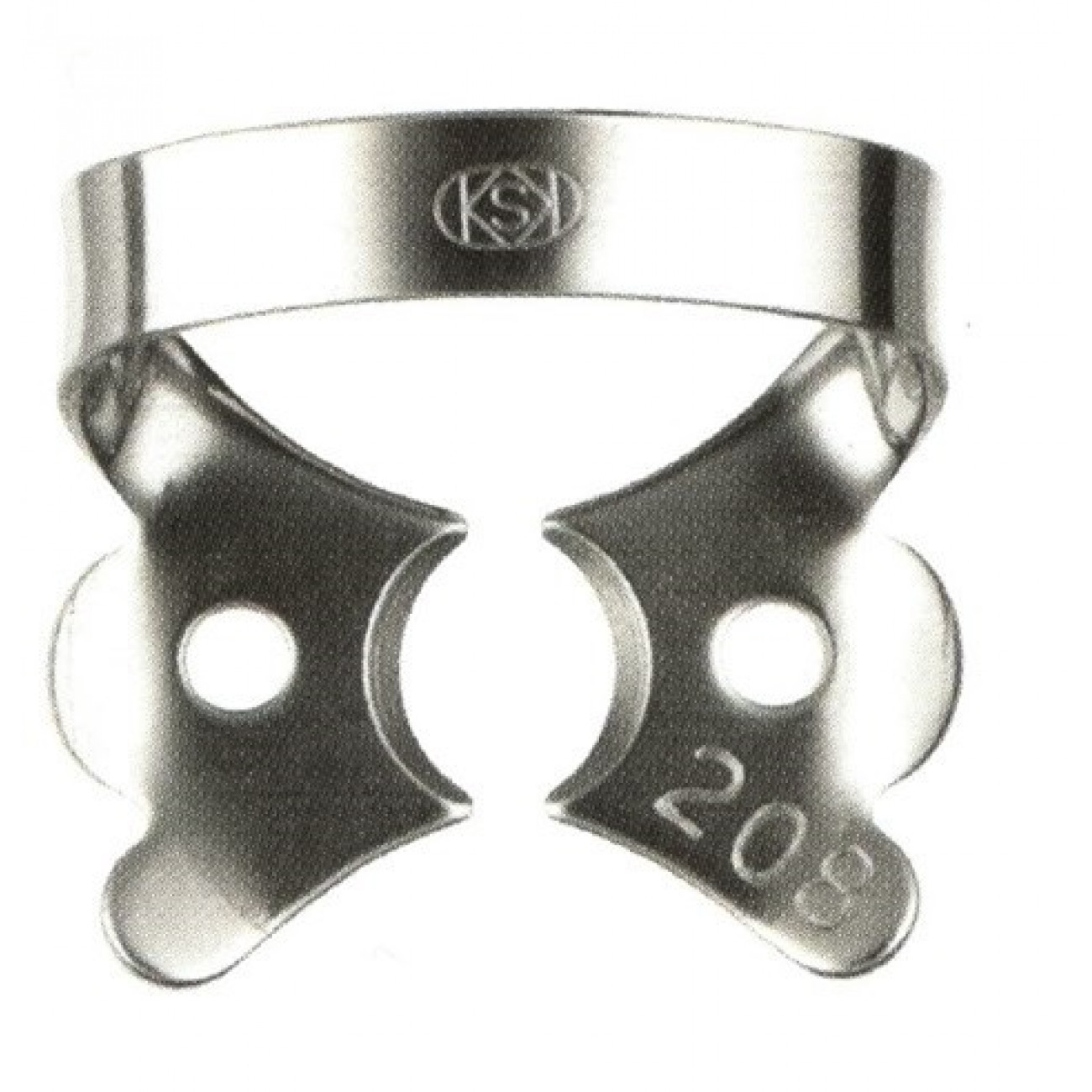 Кламп для коффердама KSK Dentech №208- Кламп для клыков и премоляров верхней и нижней челюсти, для зубов с незначительными разрушениями коронковой части, сохраненной ферулой и выраженным экватором. Латеральные крылья большого размера. Щечки клампа плоские. В отличие от клампа №2, щечки клампа шире, большого радиуса (для премоляров крупного размера), медиальные крылья имеют небольшой изгиб для более легкого взаиморасположения клампа с соседними зубами. Рекомендуется при лечении кариеса в сочетании с эндодонтией или для выполнения чернового препарирования коронковой части зуба под ортопедическую конструкцию.