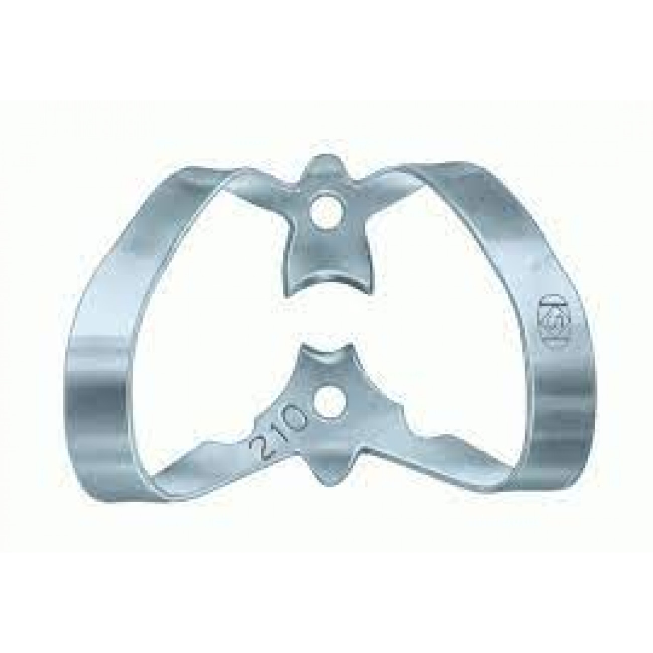 Кламп для коффердама "бабочка" для фронтальной группы зубов KSK Dentech №210 - Кламп «бабочка» с двумя дугами для резцов и клыков верхней челюсти, для зубов с выраженной небной долей коронковой части, возможно с выраженным слепым отверстием, для коронок среднего размера. Щечки разного размера, имеются крылья для фиксации клампа в перфорации латексного платка при его одевании на опорные зубы. Кламп удобен при выполнении эндодонтического лечения, внутрикоронкового отбеливания и фиксации ортопедических конструкций.