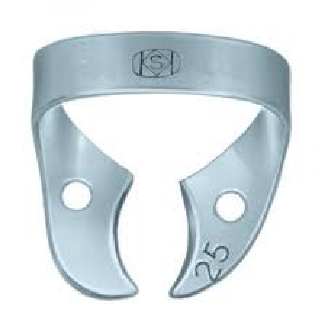 Кламп для коффердама KSK Dentech №25 - Кламп для моляров верхней и нижней челюсти. Крылья отсутствуют, щечки асимметричные. Рекомендуется при изоляции протяженных участков как якорный кламп. Он удобен при фиксации на коронки первых и вторых моляров верхней челюсти, имеющих ромбовидную форму, при небольшой дистопии зубов, соседних с изолируемым. Асимметрия щечек клампа предполагает его использование с правой стороны, но в зависимости от клинической ситуации, может быть также использован слева.
