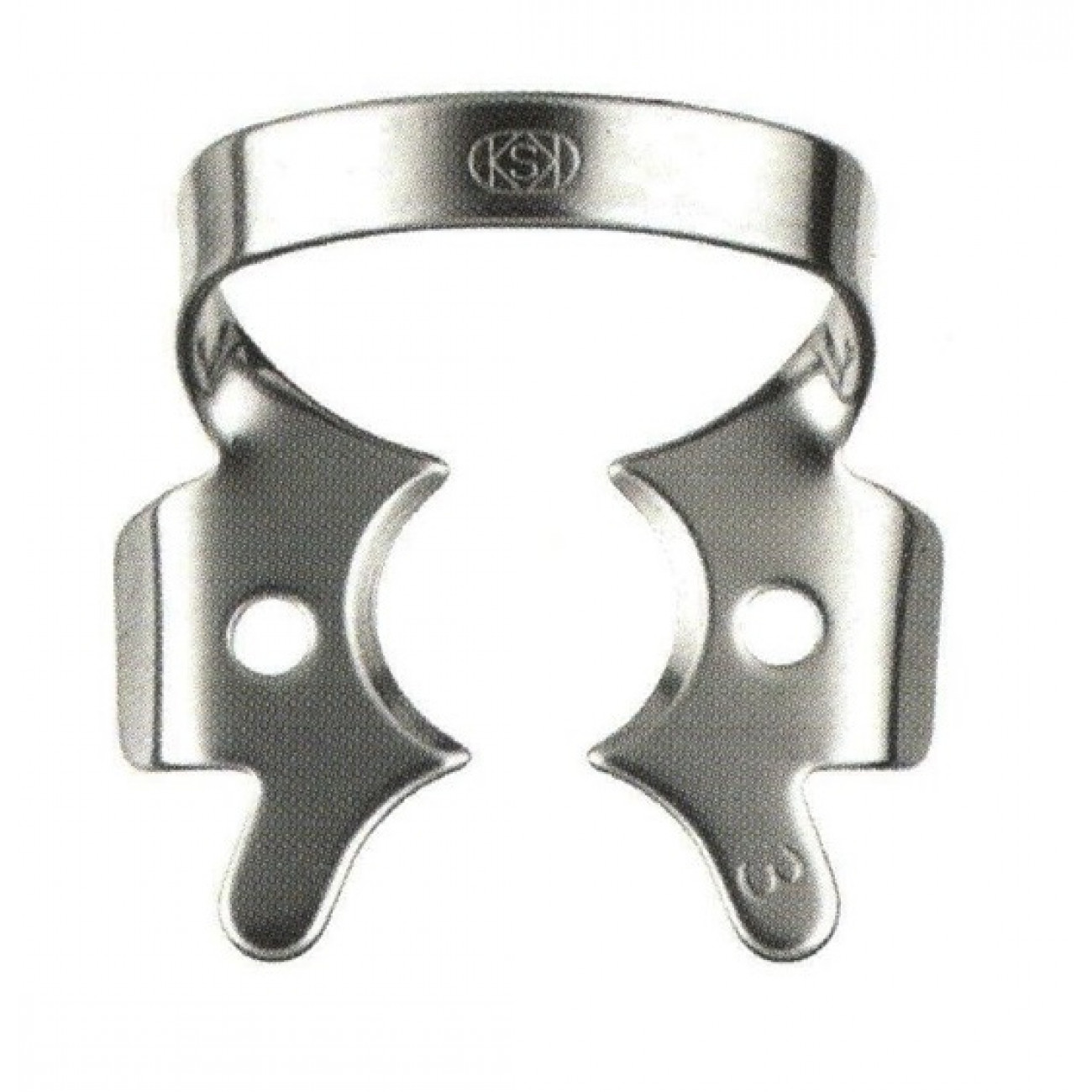 Кламп для коффердама KSK Dentech №3 - Кламп для моляров верхней и нижней челюсти, с невыраженным экватором и/или со значительно разрушенной медиальной поверхностью зуба. Благодаря небольшому размеру щечек клампа, его углы не будут проваливаться в межзубный промежуток.