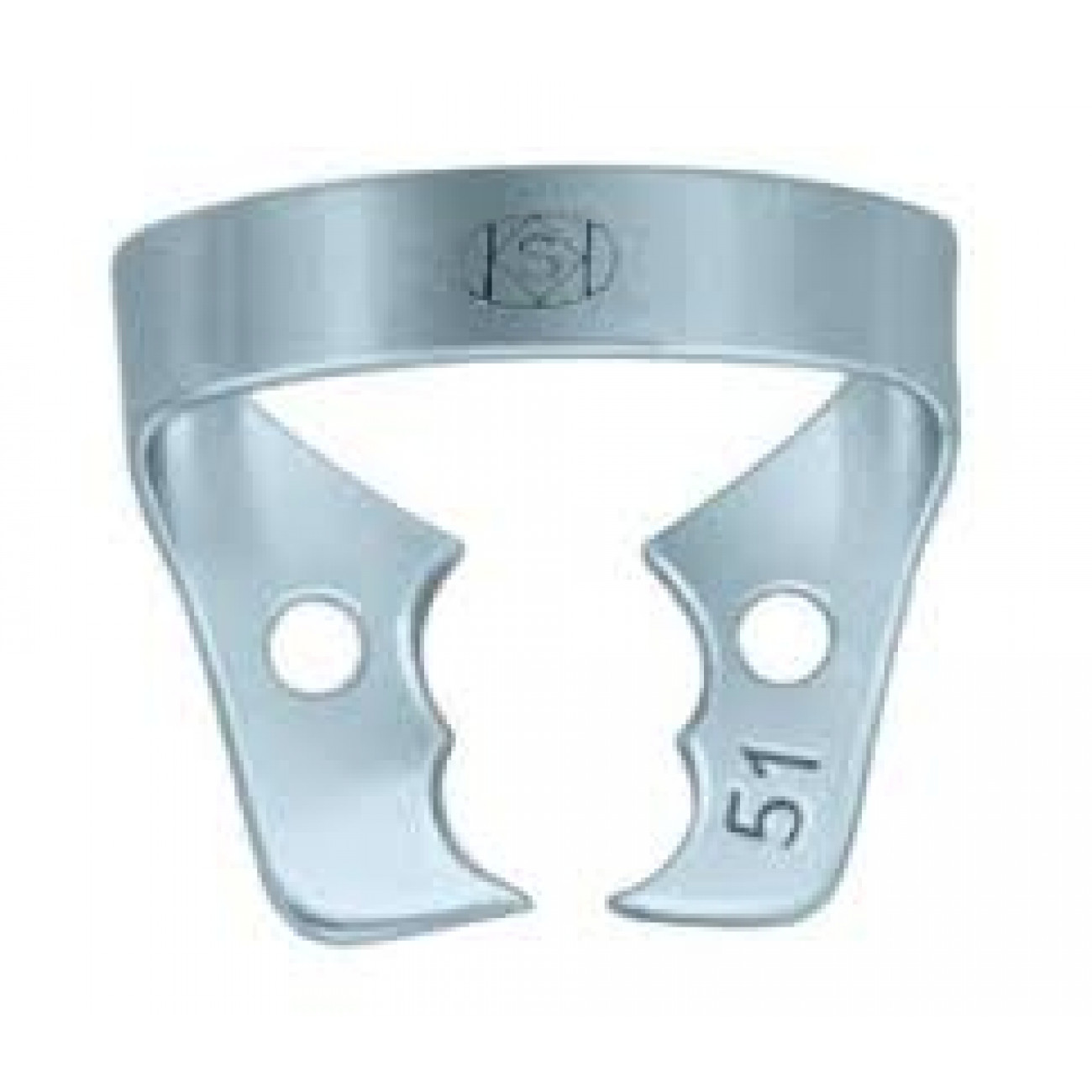 Кламп для коффердама KSK Dentech №51 - Кламп для моляров нижней челюсти. Крылья отсутствуют. В отличие от клампов №30 и №31, имеет симметричные щечки. В середине каждой из щечек имеется шип, он обеспечивает возможность дополнительной ретенции в области рецессии краевой десны в проекции фуркации корней моляров нижней челюсти с вестибулярной и лингвальной стороны (дефекты I-II класса по Гликману). Кламп хорошо фиксируется благодаря более широкой дуге и усилию, которое она развивает.