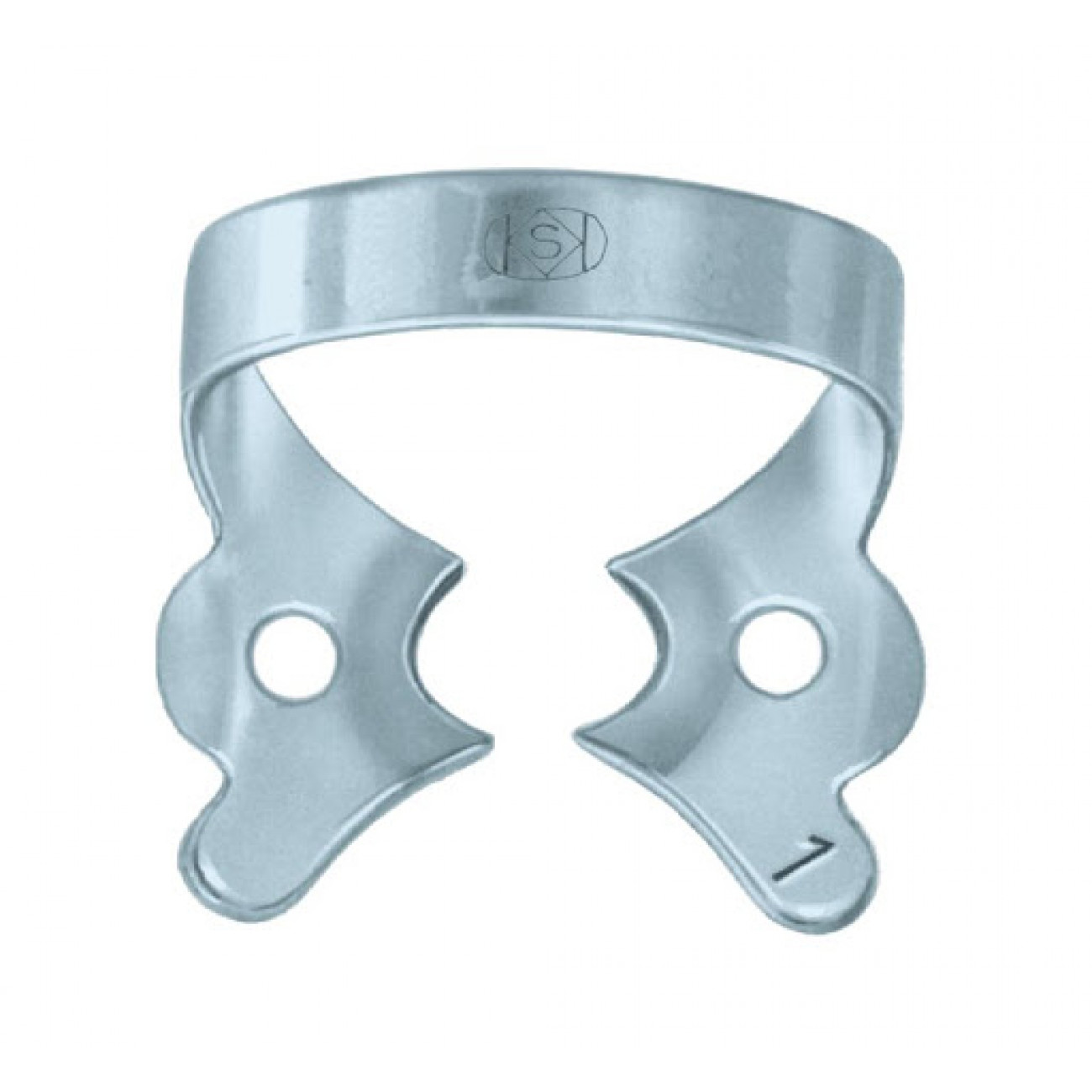 Кламп для коффердама KSK Dentech №1 - Кламп для клыков и премоляров верхней и нижней челюсти, для зубов с сильно разрушенной или отсутствующей коронковой частью (если оставшаяся часть корня при незначительной ретракции десны позволяет получить четырехточечную фиксацию клампа углами). Латеральные крылья небольшого размера. Щечки имеют воронкообразный изгиб в апикальном направлении. Рекомендуется при создании протяженных двусторонних участков изоляции зубных рядов, при лечении множественного кариеса, возможно в сочетании с эндодонтией нескольких зубов, фиксации ортодонтических ретейнеров.