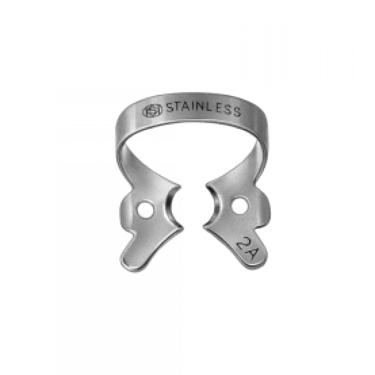 Кламп для коффердама KSK Dentech №2А- Кламп для клыков и премоляров верхней и нижней челюсти, для зубов с незначительными разрушениями коронковой части, сохраненной ферулой и выраженным экватором. Латеральные крылья небольшого размера. Щечки плоские, среднего радиуса.