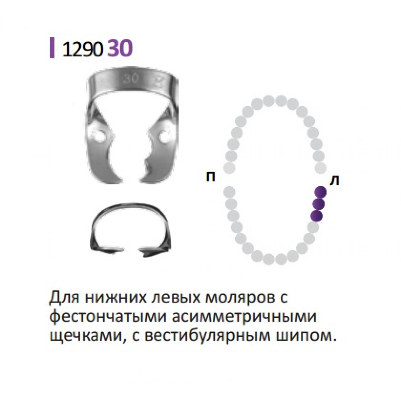 Клампы для коффердама Medenta доступны в нескольких размерах, включая кламп для моляров (№ 30). Этот размер предназначен для использования на больших зубах, таких как моляры, и обеспечивает оптимальную фиксацию и изоляцию.