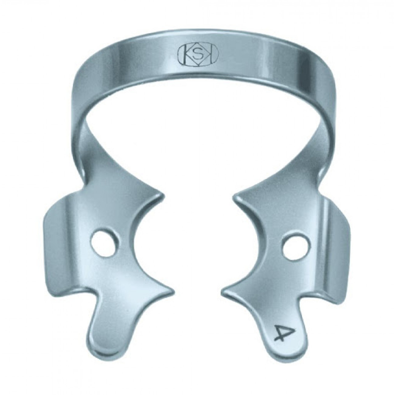 Кламп для коффердама KSK Dentech №4 - Аналог клампа №3 - для моляров верхней и нижней челюсти с небольшой или разрушенной коронковой частью. Особенность клампа - изогнутые боковые щёчки для надежной фиксации в области шейки зуба. Во избежание травмы десны при установке этого клампа требуется дополнительная осторожность.
