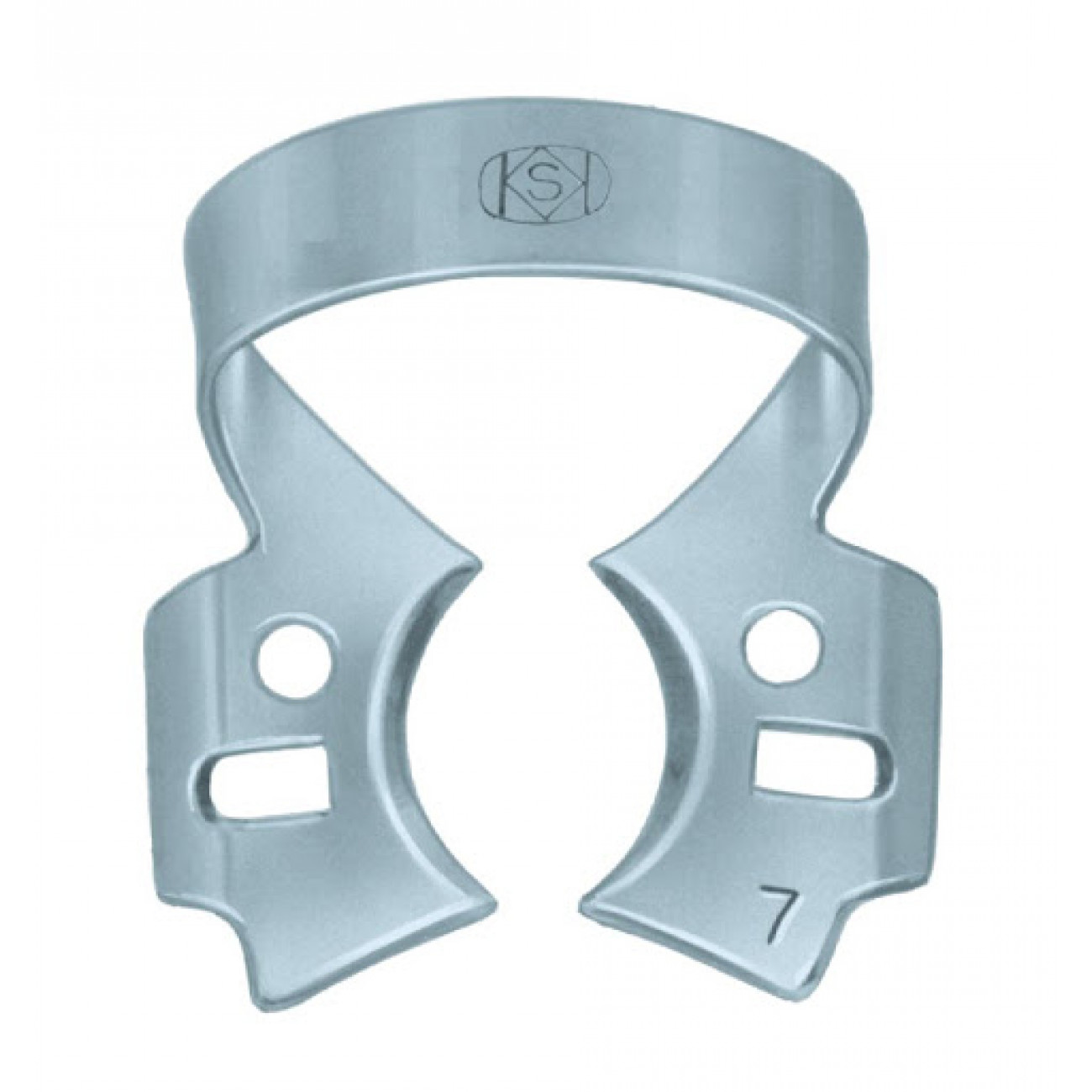 Кламп для коффердама KSK Dentech №7 - Кламп для моляров верхней и нижней челюсти. Особенность клампа - плоские боковые щечки. Его надежная фиксация возможна при наличии выраженного экватора коронковой части зуба. На боковых крыльях имеются дополнительные овальные отверстия, облегчающие снятие края перфорации латексного платка при установке. Один из наименее агрессивных клампов, может применяться при реставрации I-класса по Блэку, если она проводится на фиссурном кариесе.