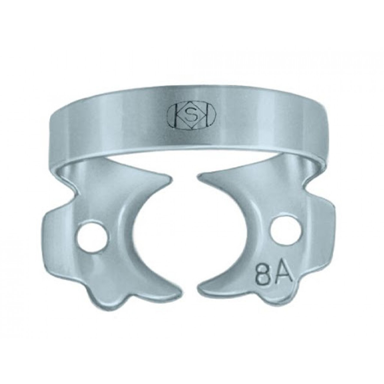 Кламп для коффердама KSK Dentech №8А - Кламп для моляров верхней и нижней челюсти с очень разрушенной, практически отсутствующей, коронковой частью. Удлиненные боковые щечки и выступающие углы позволяют надежно фиксировать его на корне моляра на уровне десневой борозды и ниже.
