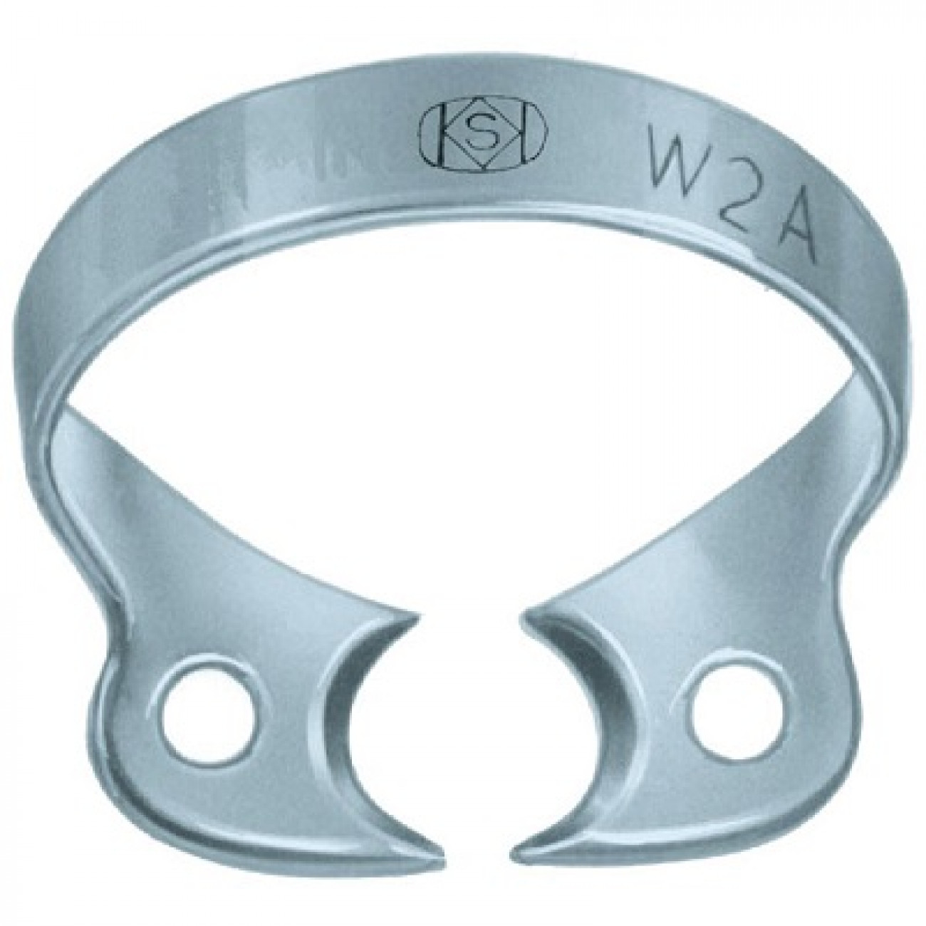 Кламп для клыков и премоляров верхней и нижней челюсти, для зубов с незначительными разрушениями коронковой части, сохраненной ферулой и выраженным экватором. Латеральные крылья отсутствуют. Щечки плоские, среднего радиуса. Рекомендуется при протяженных двусторонних изоляциях фронтальных участков верхней и нижней челюсти, при препарировании под несъемные ортопедические конструкции и их адгезивной фиксации, при лечении множественного кариеса в сочетании с эндодонтией нескольких зубов, фиксации ортодонтических ретейнеров.