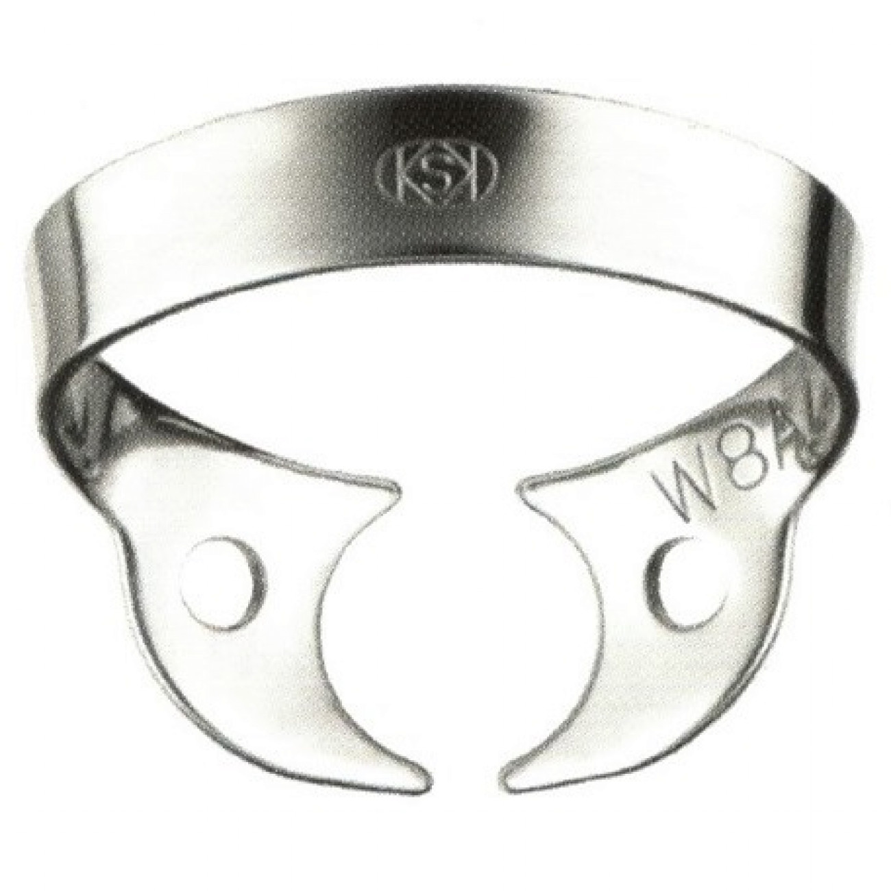 Кламп для коффердама KSK Dentech №W8А - аналог клампа Brinker B1- кламп для моляров верхней и нижней челюсти с очень разрушенной, практически отсутствующей, коронковой частью. Удлиненные боковые щечки и выступающие углы позволяют надежно фиксировать его на корне моляра на уровне десневой борозды и ниже. Отсутствие крыльев позволяет использовать кламп в дистальных участках зубного ряда у пациентов с небольшими размерами челюстей или очень выраженной косой линией нижней челюсти.