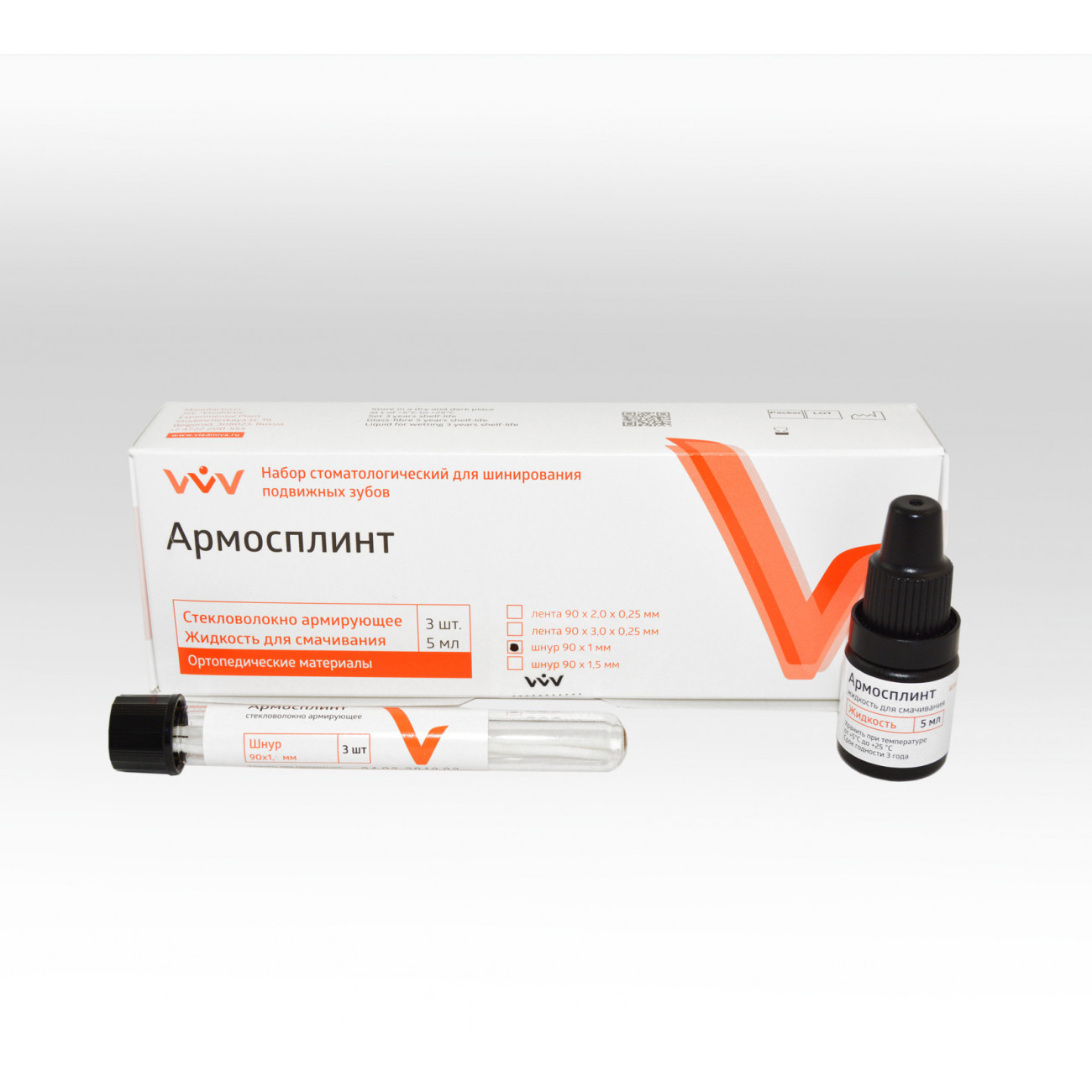 В набор «Армосплинт» входят: стекловолокно, жидкость для смачивания стекловолокна, текучий композит, адгезивная система.