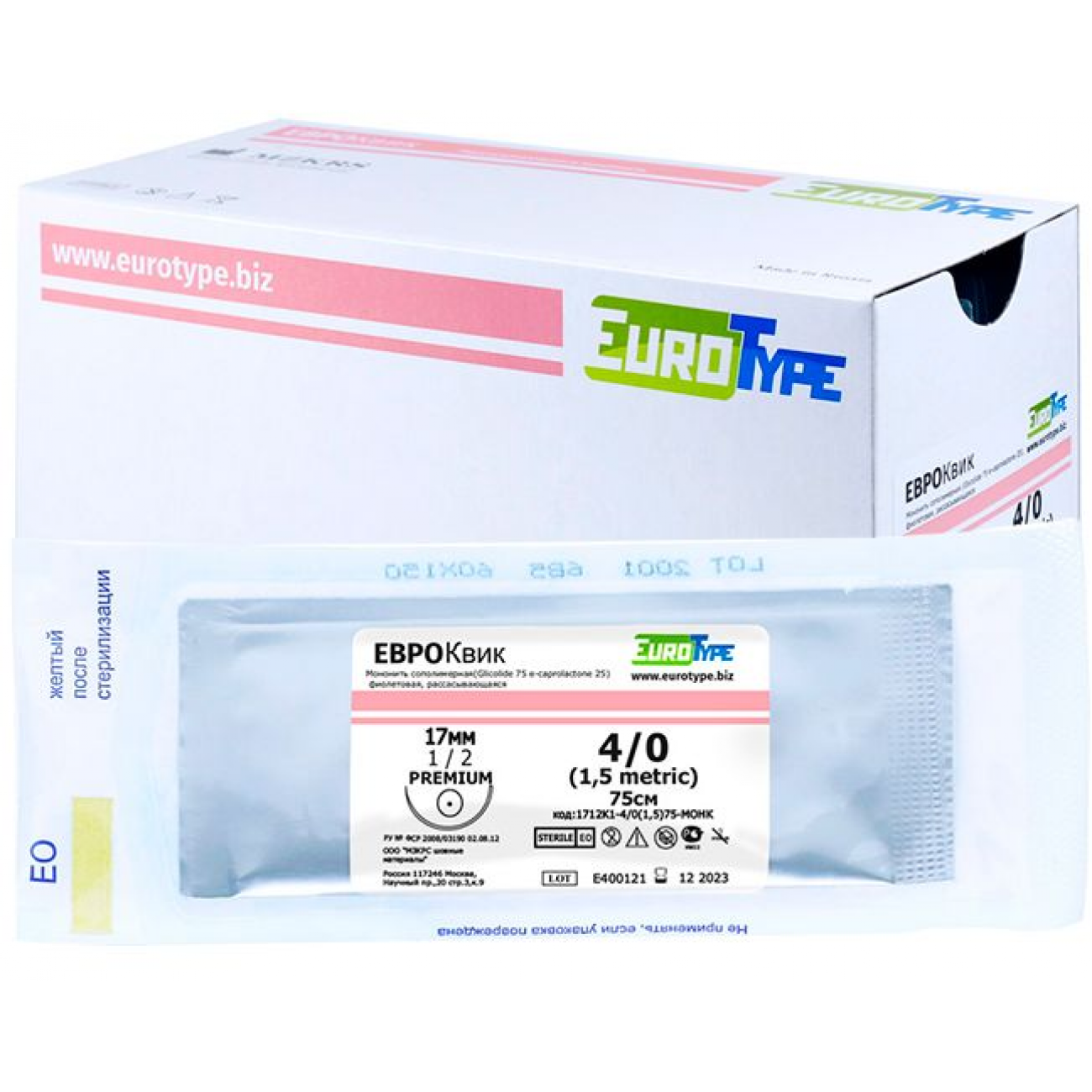 ЕВРОКВИК – рассасывающийся стерильный хирургический шовный материал. Нить монофиламентная (мононить) из сополимера гликолевой кислоты (75%) и Е-капролактона (25%). Гладкая поверхность способствует быстрому заживлению за счет снижения травмирования тканей при зашивании. Отсутствие эффекта фитильности снижает вероятность послеоперационного инфицирования. Рассасывание материала происходит посредством гидролиза. Срок рассасывания короткий. Через неделю после имплантации нить сохраняет не более 50% прочности. Полностью материал рассасывается между 90-120 сутками. Для лучшей идентификации нить окрашена в фиолетовый цвет. Игла атравматическая Premium из нержавеющей стали, режущая, 3/8 окружности. Высокое качество полировки и специальное соединение нити снижает вероятность травмирования сшиваемых тканей.