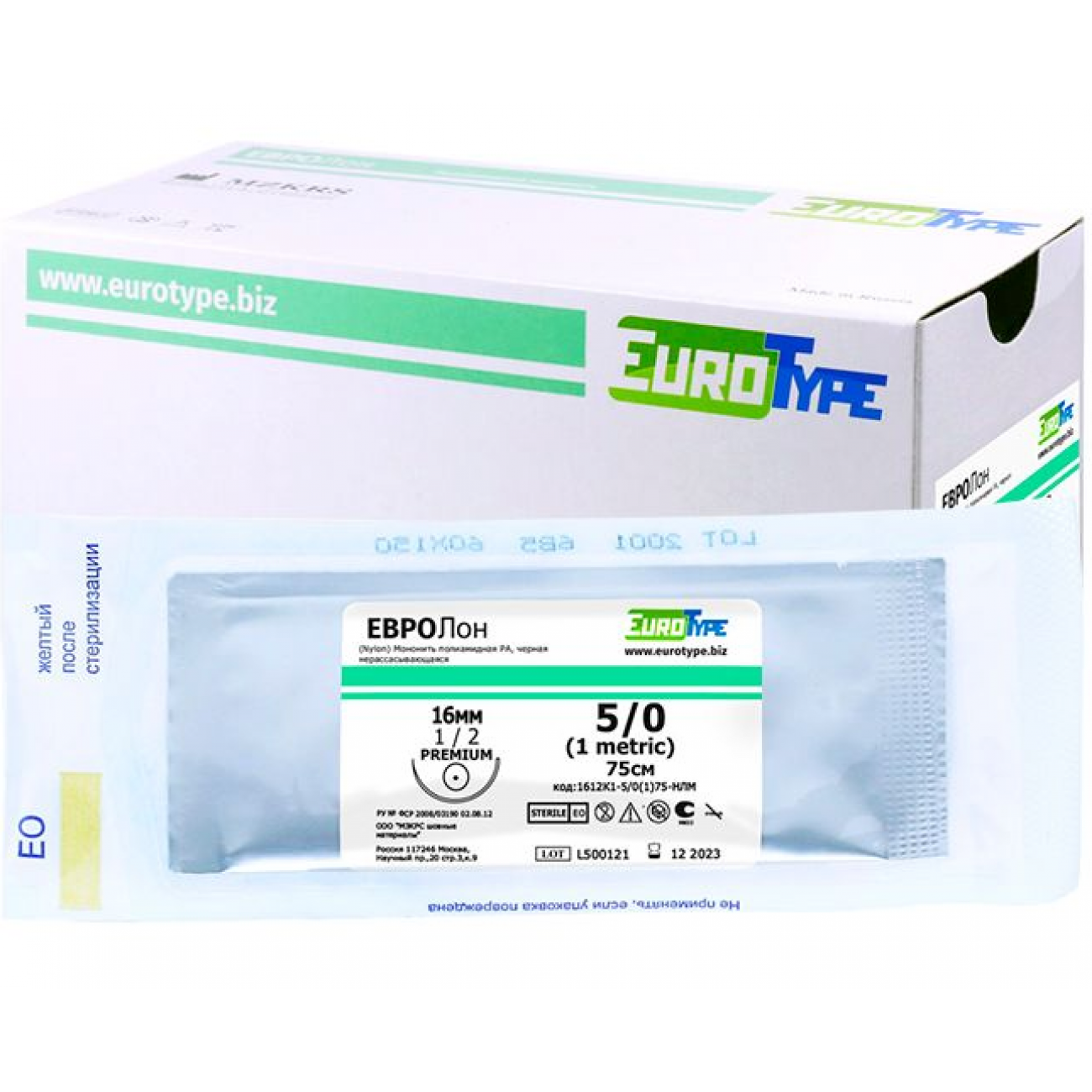 ЕвроЛон 5/0, 75см, 16мм, кол.1/2, 12шт. синтетический монофиламентный нерассасывающийся шовный материал из полиамида 6/6