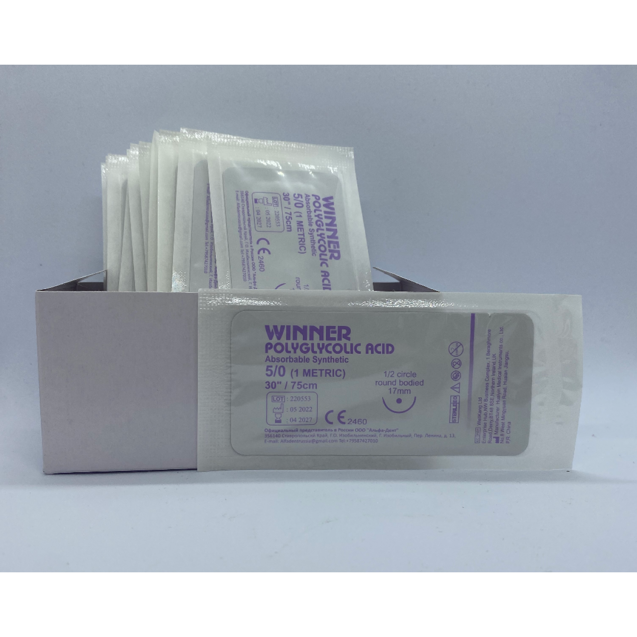 ПГА - нить, диаметр нити 5/0, круглая колющая игла, размер иглы 17 мм, ½ изгиб, длина нити 75см