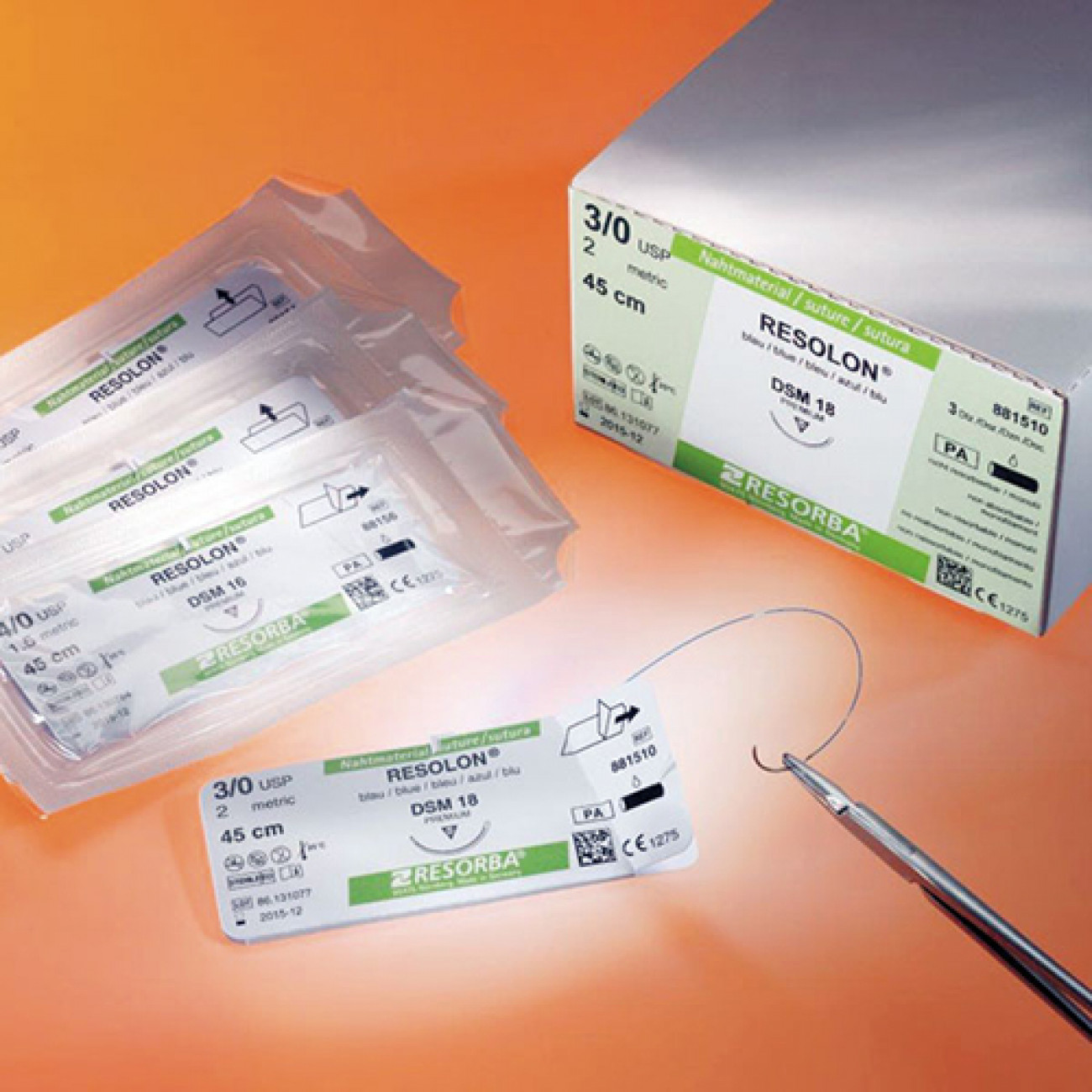 Шовный материал Резолон. Нерассасывающаяся монофиламентная нить из полиамида 6. Легко проходит через ткани, при завязывании образует гладкие и очень надежные узлы.(аналог Этилон, Дафилон) Нить:синяя, 6-0 USP (0.7 EP), 0,45м. Игла:13 мм, 3/8 круга, обратно - режущая