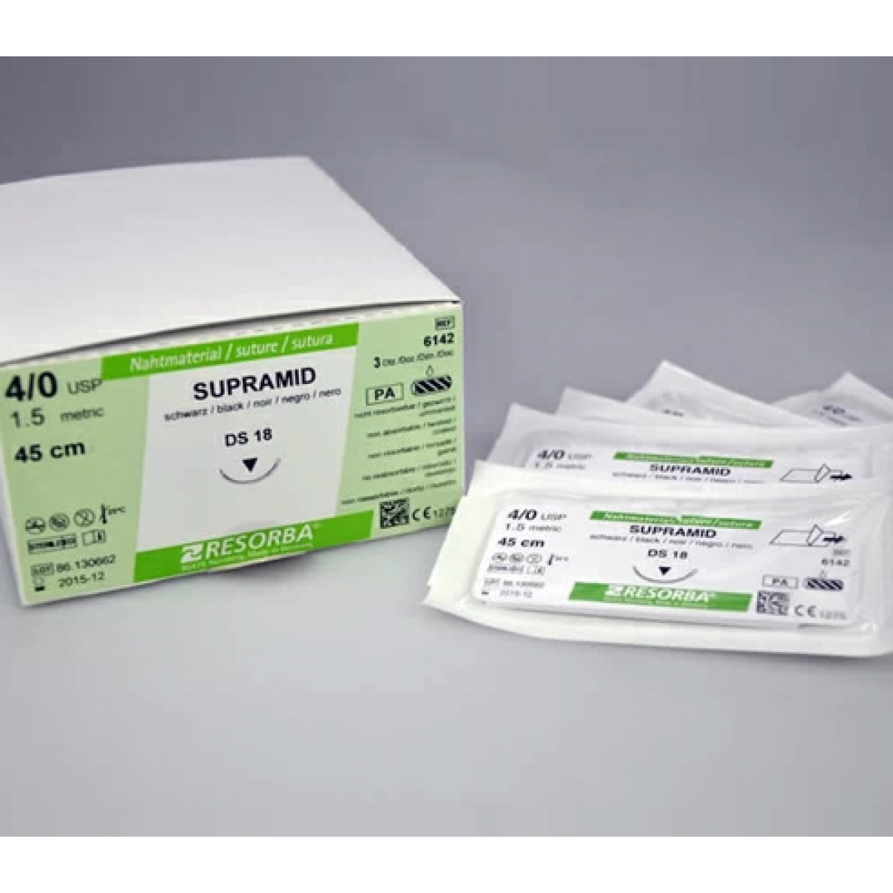 Шовный материал Супрамид. Нить: черная (1,5 EP) 4-0 USP, 0.45 м. Игла: 18 мм, 1/2 окружности, обратно-режущая. Синтетическая нерассасывающаяся монофиламентная нить. Полиамидный материал, произведенный в результате поликонденсации аминокапроновой кислоты. Особенностью структуры является хаотичное расположение пучков монофиламентов внутри волокна, заключенных внутри турбки, образуемой специальным покрытием, что придает ему свойство монофиламентного материала с присущей монофиламентам гладкой поверхностью. 36 шт/уп. Указана цена 1 упаковки.