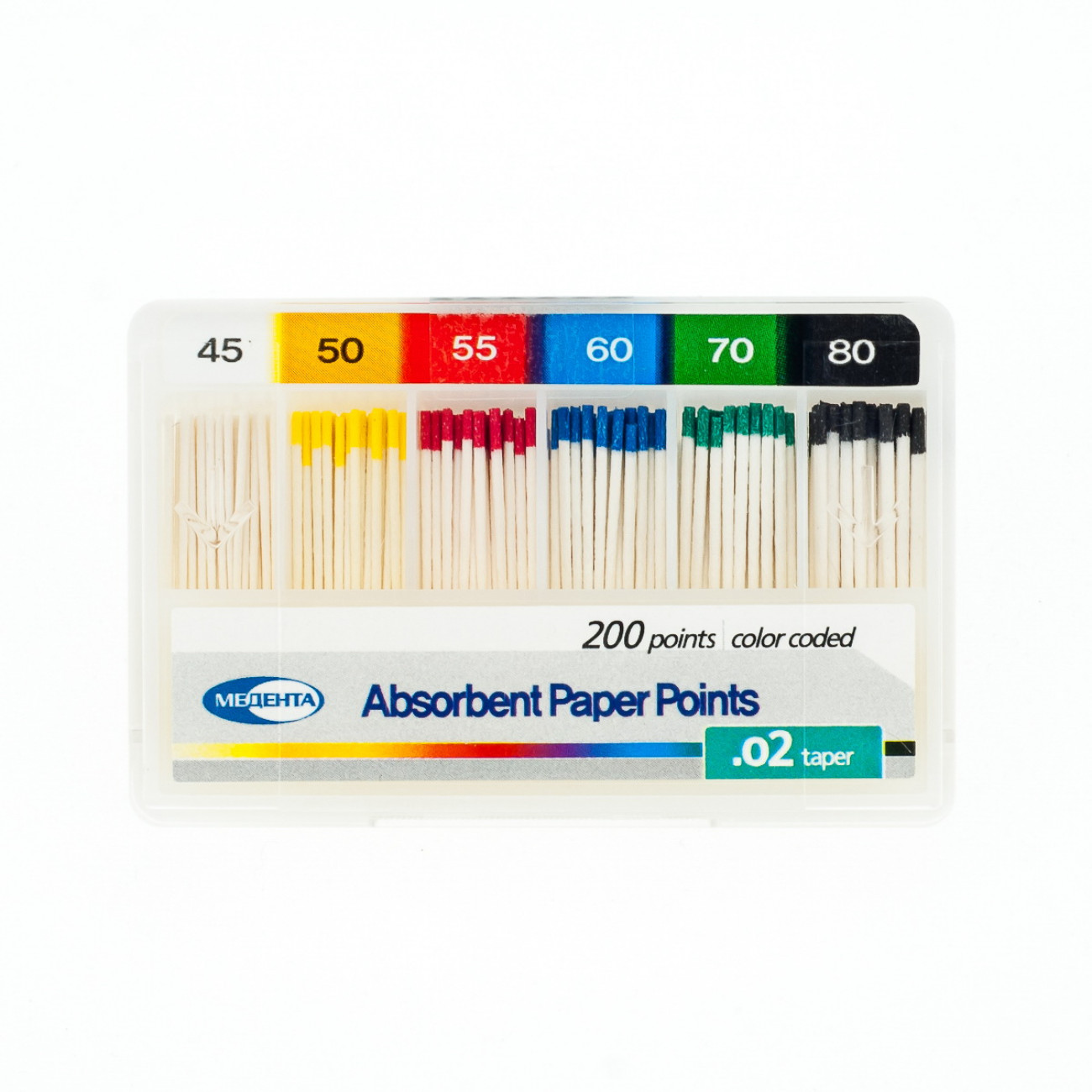 Штифты эндоканальные абсорбирующие бумажные Медента .02 размеров №45-80 в ассортименте от компании Мета Биомед предназначены для высушивания полости корневого канала зуба перед обтурацией и пломбированием с целью лучшей адаптации и равномерной полимеризации пломбировочного и герметизирующего материала. Бумажные штифты Мета также могут применяться для внесения пломбировочного силера в корневой канал.