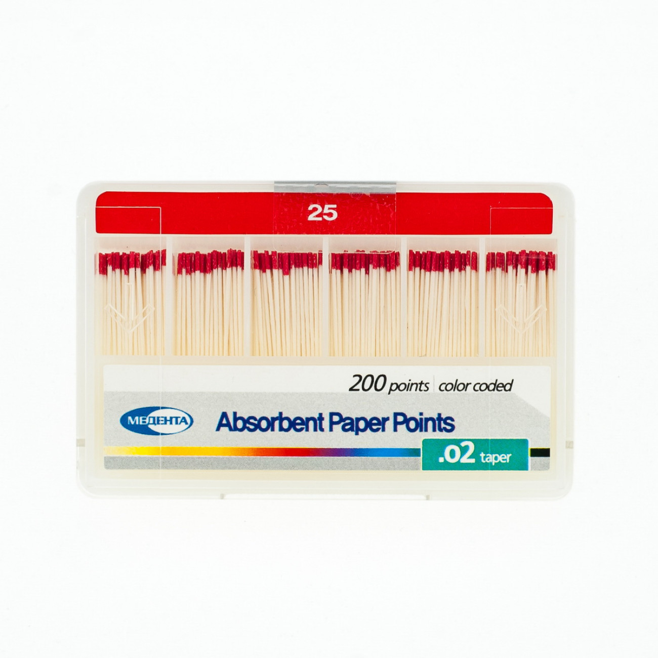 Штифты эндоканальные абсорбирующие бумажные Медента .02 №25 от компании Мета Биомед предназначены для высушивания полости корневого канала зуба перед обтурацией и пломбированием с целью лучшей адаптации и равномерной полимеризации пломбировочного и герметизирующего материала. Бумажные штифты Мета также могут применяться для внесения пломбировочного силера в корневой канал.